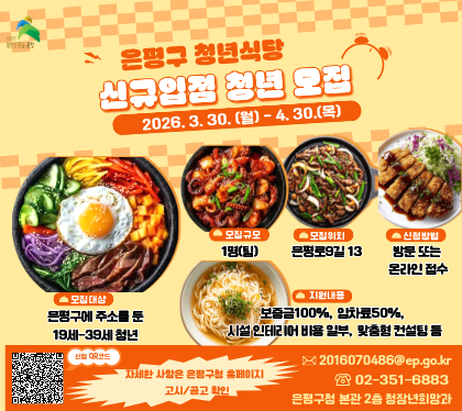 🍽️ 은평구 청년식당 신규입점 청년 모집! 은평구에서 청년 창업자의 도전을 응원하고, 지역경제 활성화를 위한 청년식당 신규 입점 청년을 모집합니다 😊 ✔️ 모집기간 2026. 3. 30.(월) ~ 4. 30.(목) 18시까지 ✔️ 모집대상 은평구 거주 19~39세 청년 ✔️ 모집규모 1명(팀) 💡 지원 내용 - 보증금 100% 지원 - 임차료 50% 지원 - 시설 인테리어 일부 지원 - 창업 컨설팅 지원 📝 신청 방법 - 이메일 접수 : 2016070486@ep.go.kr - 방문 접수 : 은평구청 2층 청장년희망과 ※ 자세한 내용은 공고문 참고 👉 창업을 고민 중인 청년이라면 꼭 주목! 👉 실질적인 지원으로 시작할 수 있는 기회 지금 바로 도전해보세요 🚀