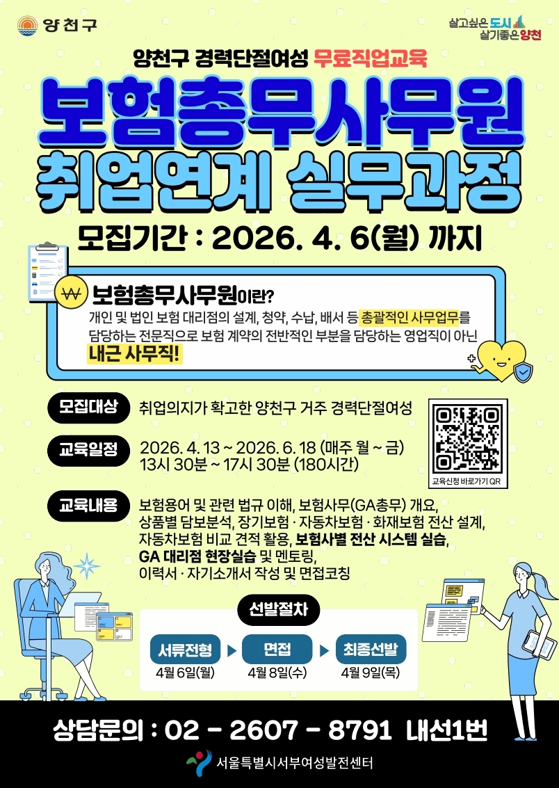 다시 시작하는 당신의 커리어, 서울시서부여성발전센터와 꽃피우세요! "지난 경력은 잠시 멈춤이었지만, 새로운 도전은 지금부터입니다.🌟" 88.2%라는 높은 취업률이 증명하는 탄탄한 실무 교육, 보험총무사무원 취업연계 과정이 여러분의 새로운 시작을 돕습니다. 전문 지식부터 현장 실습, 1:1 취업 코칭까지! 양천구와 함께 당당한 프로로 거듭날 기회를 놓치지 마세요. 신청기...