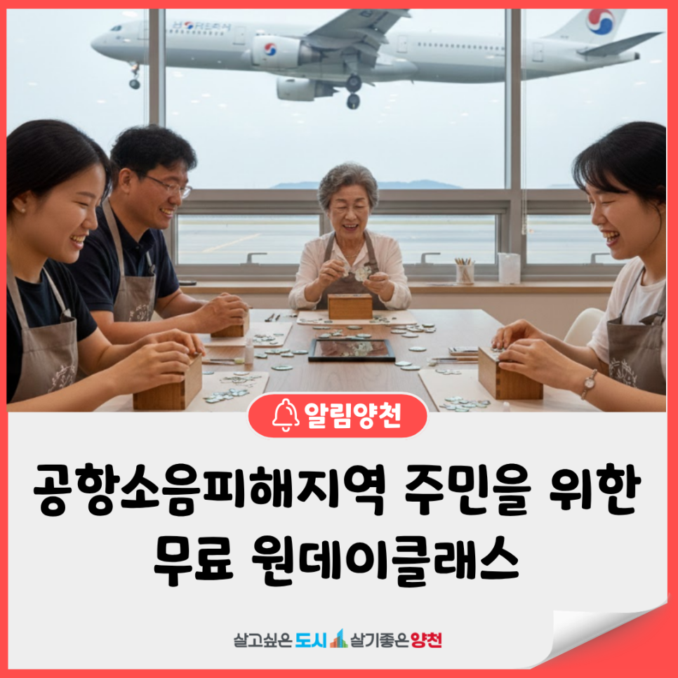 🛫비행기 소음은 잠시 OFF, 감성은 ON! 공항 소음 피해 지역 주민들을 위한 힐링 공예 원데이 클래스가 3월 모집으로 다시 돌아왔습니다~! 지난번 일괄 모집 시 너무 빠르게 마감되어 아쉬워하셨던 분들이 많으셨죠?😭 그래서! 📢 더 많은 구민들과 함께하기 위해 매월 모집으로 변경합니다. 비행기 소음 대신 따뜻한 차 한 잔과 공예의 즐거움이 가득한 시간을 만들어 드리겠습니다. 3월에 웃...