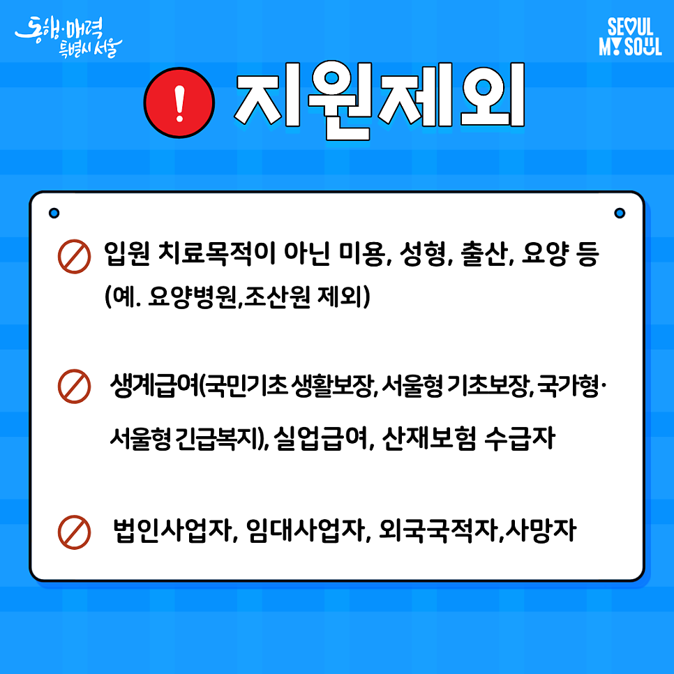 치료는 안심! 일상은 든든! 서울형 입원 생활비 지원이란? 일용직·이동노동자·아르바이트생, 1인 소상공인 등 서울시 가입원·국가 일반건강검진 기간 동안 연 최대 14일 생활비 지원을 해드리는 사업입니다. 지원내용 ✔️ 입원 13일 (연계 외래진료 3일 포함) ✔️ 국민건강보험공단 일반건강검진 1일 지원금액 1일 96,960원 지원대상 🔹 입원, 입원연계 외래진료, 국가 일반건강검진일 ...