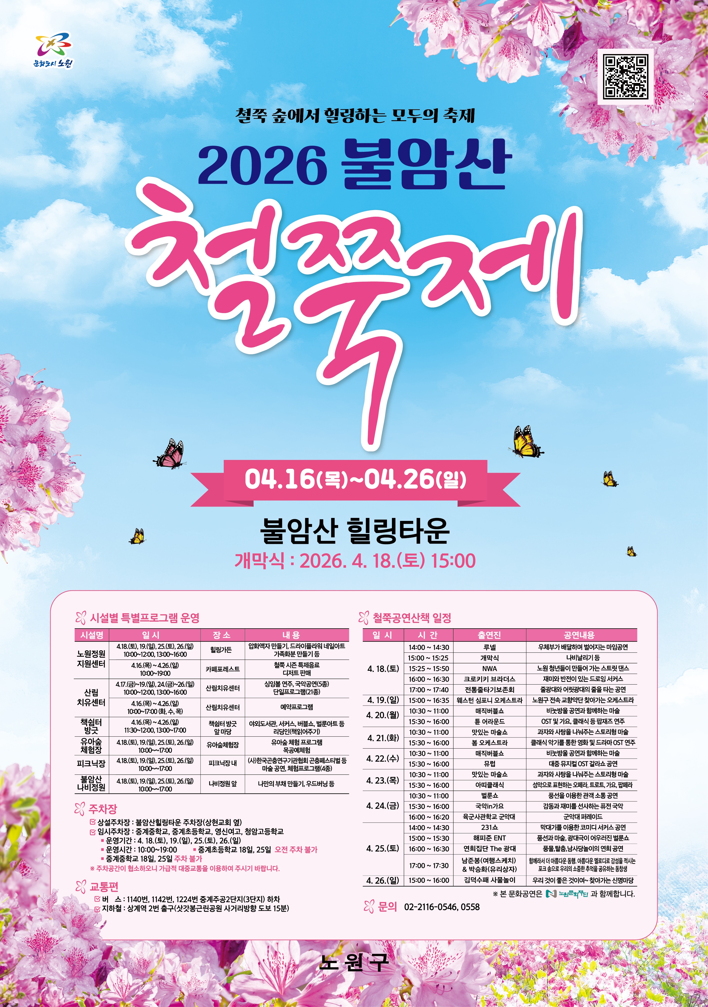 노원구 <2026 불암산 철쭉제 개최> 🌸행사기간 : 2026. 4. 16.(목) ~ 4. 26.(일) 🌸 행사장소 : 불암산 힐링타운 일대 🌸 주요내용 - 주말 철쭉공연산책 및 평일 버스킹 공연 - 힐링마켓 운영, 푸드트럭 및 푸드마켓 운영 - 불암산 힐링타운 시설별 특별프로그램 및 야외도서관 운영 등 🌸오시는길 - 버 스 : 1140번, 1142번, 1224번 중계주공2단지(3단지) 하차 - 지하철 : 상계역 2번 출구에서 도보 15분 - 주 차 : 불암산 힐링타운 주차장, 중계중 운동장, 중계초 주차장, 영신여고 운동장, 청암고등학교 등
