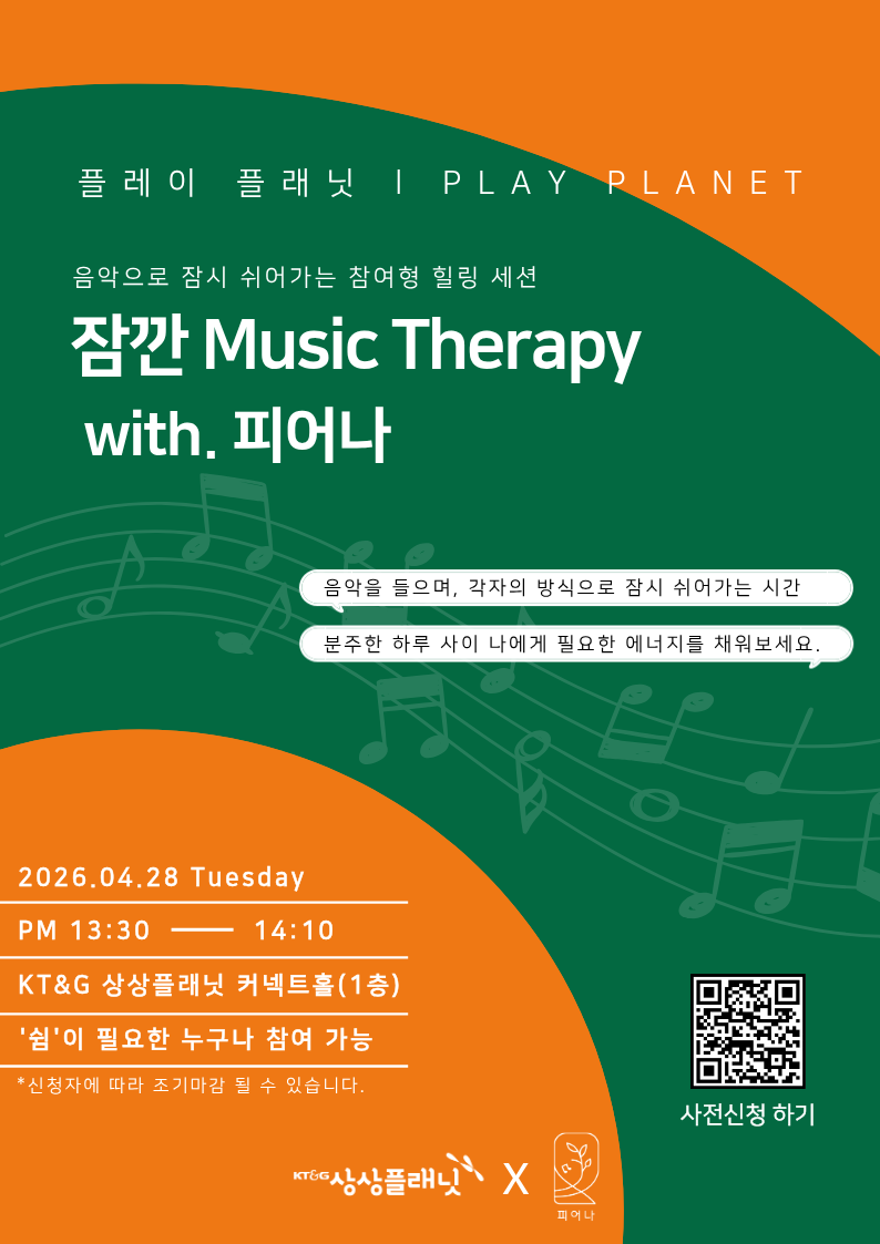 [플레이 플래닛 X 피어나] 음악으로 쉬어가는 4월의 플레이 플래닛 🌿 KT&G 상상플래닛 문화/예술 프로그램 PLAY PLANET, 이번 4월에는 입주사 ‘피어나’와 함께 음악을 들으며 각자의 방식으로 잠시 쉬어가는 시간을 준비했어요. 분주한 하루 속, 전문 음악 치료사의 안내에 따라 음악을 감상하며 그림을 그리거나, 짧은 글을 남기거나, 혹은 그저 편안히 듣기만 해도 괜찮습니다. 잠시 멈춰 나에게 집중하는 시간, 4월의 ‘쉼’과 ‘에너지’를 플레이 플래닛에서 채워보세요. ✨ ✔ 프로그램 정보 일시: 2026년 4월 28일 (화) 13:30 ~ 14:20 장소: KT&G 상상플래닛 1층 커넥트홀 ✨ 입주사 ‘피어나’와 함께합니다. ✅ 참여 안내 사전 신청 선착순 10명까지는 좌석이 우선 제공됩니다. 선착순 10명 이후 신청자는 대기번호가 부여됩니다. 현장 참여도 가능하며, 잔여 좌석이 있을 경우 참여하실 수 있습니다. ✍🏻 신청 방법 아래의 신청폼 작성 https://form.naver.com/response/WYj_OLsT84l_Jb4Z970t4w 🌿 바쁜 일상 속, 나만의 속도로 쉬어가는 시간 지금 바로 신청해보세요!