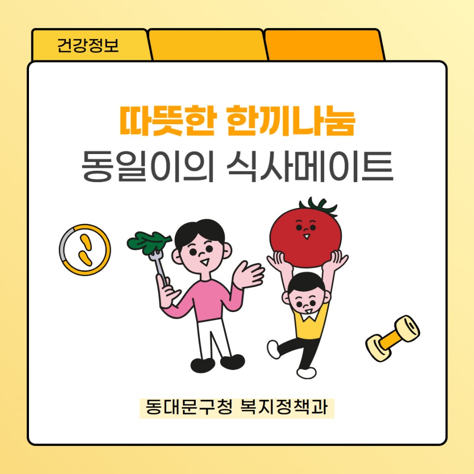 <동일이의 식사메이트> 2기 참여자 모집 오늘만큼은 혼밥 말고 같이 먹어보는 건 어때요🍽️ 음악이 함께하는 따뜻한 한 끼,<동일이의 식사메이트> 나눠보세요!🍱 신청대상 서울시 생활권 중·장년 1인가구 진행기간 5. 11.(월) ~ 6. 4.(목) 매주 월·목요일 15:00 ~ 18:00 *5월 마지막 주는 프로그램 미진행 진행장소 씽글벙글 사랑방 이음마루(동대...