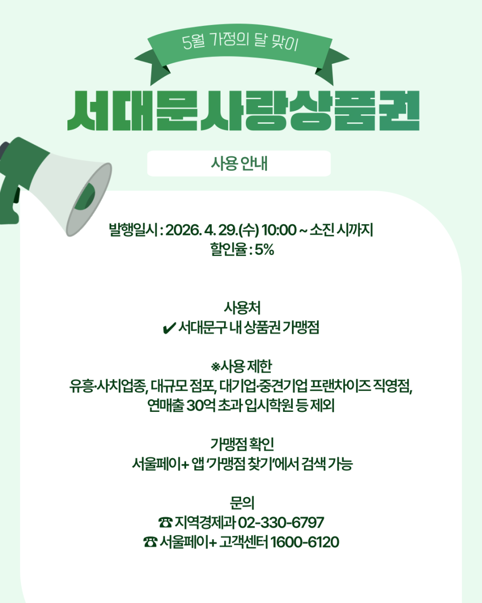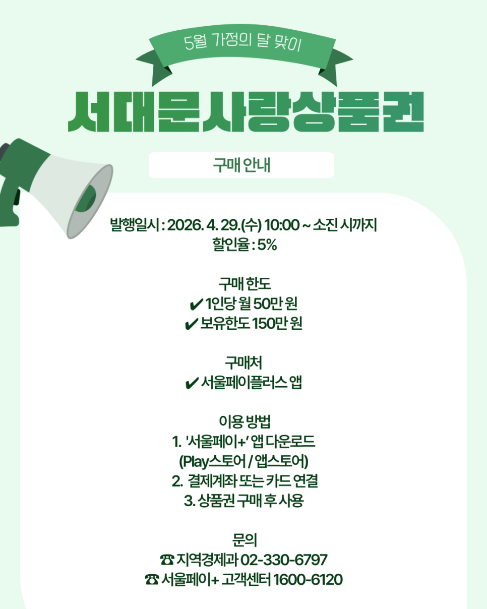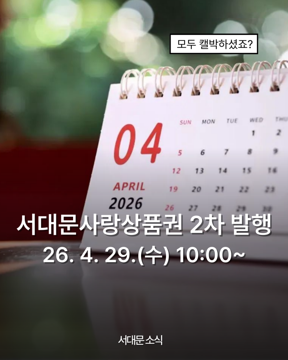 💸서대문사랑상품권 2차 발행 안내 (2026. 4. 29.(수) 10:00 ~ 소진시까지) 지역경제도 살리고, 할인 혜택도 챙길 수 있는 서대문사랑상품권이 발행됩니다! 😊 서대문사랑상품권 2차 발행 📌 발행 안내 📅 발행일시 : 2026. 4. 29.(수) 10:00 ~ 소진 시까지 💰 할인율 : 5% 👛 구매 한도 ✔ 1인당 월 50만 원 ✔ 보유한도 150만 원 👛 구매...