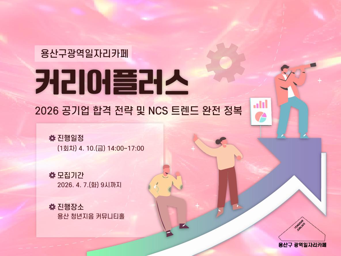 1. 목적 : ⭐️강의목표⭐️ ✔2026 공기업 채용 시장 변화와 최신 트렌드 이해 ✔NCS 핵심 영역(의사소통·수리·문제 해결) 집중 분석 ✔실전 문제풀이 전략 및 시험장 노하우 습득 2. 신청대상 : ⭐️강의대상⭐️ ▸공기업 취업을 준비 중인 청년◂ ▸NCS 시험을 처음 준비하거나 점수가 정체된 분◂ ▸최신 채용 트렌드와 전략이 필요한 취준생◂ 3. 신청기간 : ~ 2026.04.07 09:00 4. 진행일정 : 4월 10일(금) 14:00~17:00 5. 진행내용 : 🔹공기업 채용 트렌드 및 전략🔹 • 2026 공기업 채용 시장 변화 • 직무 중심 채용 트렌드 분석 • 실제 합격 사례 및 전략 공유 • 자소서 및 면접 준비 로드맵 🔹NCS 집중 분석 (의사소통 & 문제해결)🔹 • 지문 독해 시간 단축 전략 • 키워드 매칭 및 문제 접근 방법 • 논리 추론 및 문제 해결 유형 정복 • 시험장에서 버릴 문제 선별법 🔹NCS 집중 분석 (수리능력 & 실전 팁)🔹 • 자료해석 시간 단축 계산법 • 필수 공식 정리 및 응용 문제 접근법 • 시간 관리 전략 (80:20 법칙) • 실전 시험 노하우 및 멘탈 관리 6. 진행장소 : 용산청년지음 커뮤니티홀 . 신청방법 : 미니인턴 링크 (https://miniintern.com/event/3120) 8. 문의 연락처 : 용산광역일자리카페 - 02-6261-1932