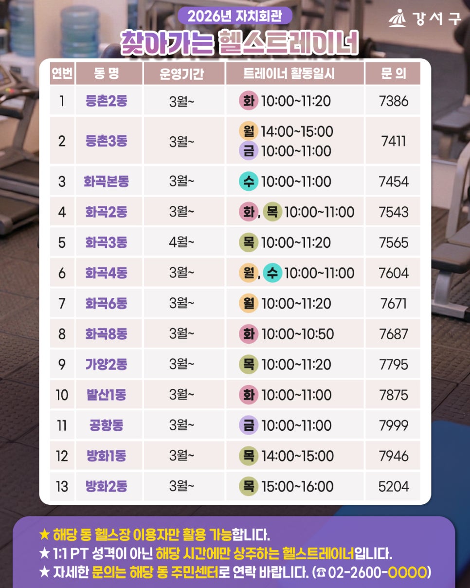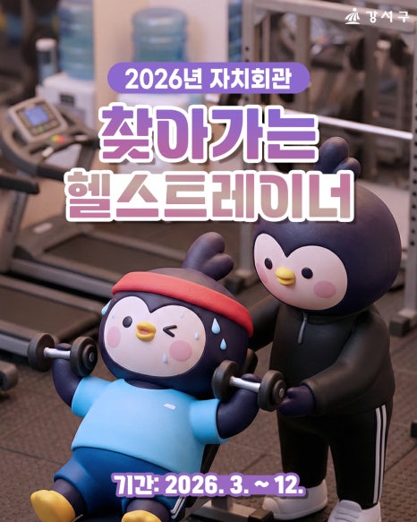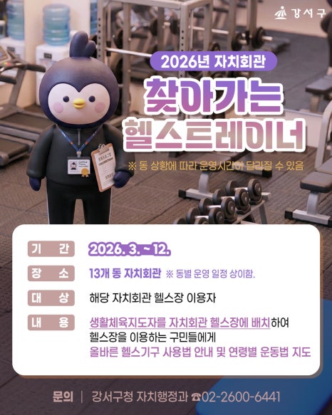 헬스장 기구,“이거… 어떻게 쓰는 거지?” 고민해본 적 있으신가요? 🤔 강서구가 구민 여러분의 건강한 운동을 위해 2026년 ‘자치회관 찾아가는 헬스트레이너’를 운영합니다! 생활체육지도자가 직접 자치회관 헬스장을 찾아가 ✔ 올바른 헬스기구 사용법 ✔ 연령별·체력별 맞춤 운동 방법을 현장에서 친절하게 안내해 드려요 💪 📅 운영 개요 기 간: 2026년 3월 ~ 12월 장 ...