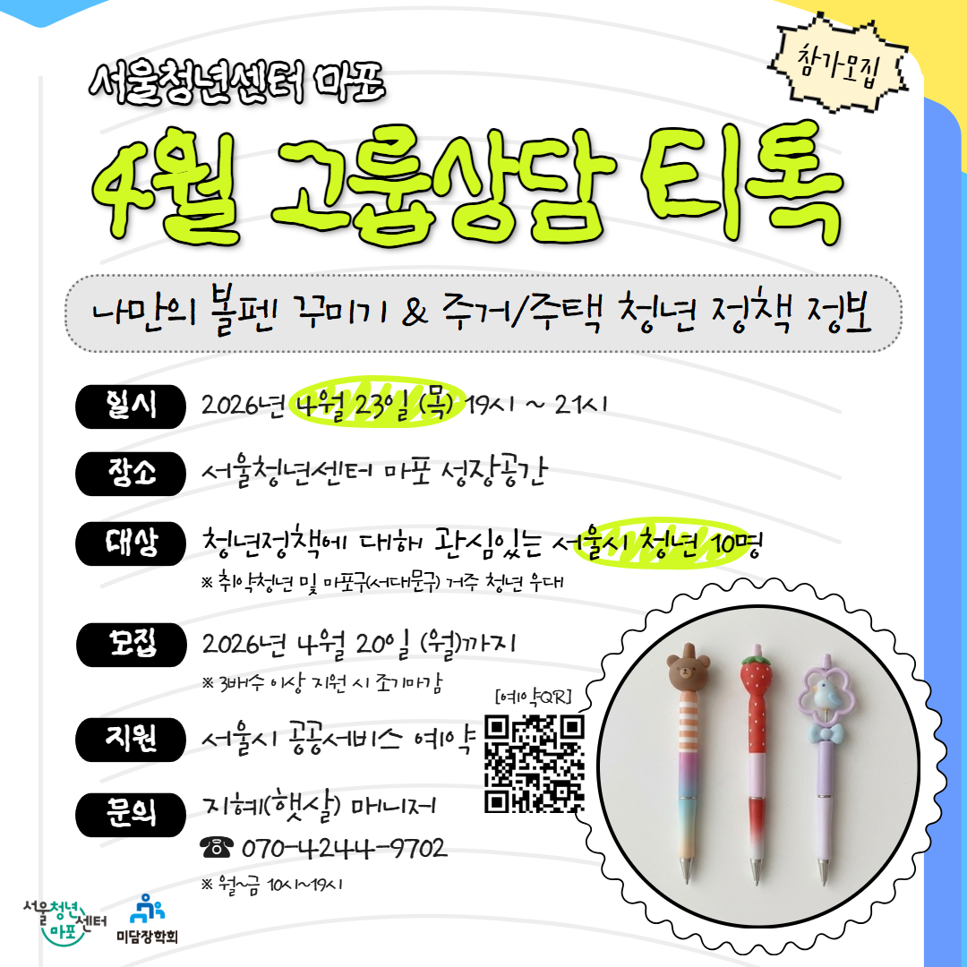 안녕하세요, 서울청년센터 마포입니다! ✨ 2026년 4월 티톡 주제는 <나만의 볼꾸(볼펜 꾸미기) & 주거·주택 청년정책 알아보기> 입니다! 🖊️🏠 서울청년센터 마포의 지혜(햇살) 매니저와 함께 청년 지원정책과 주거·주택 관련 유용한 정보를 알아보고, 편안한 분위기 속에서 이야기도 나누며 직접 볼펜 꾸미기 활동까지 함께해요! 💬💛 정책 정보도 얻고, 요즘 유행하는 볼펜 꾸미기도 동대문까지 가지 않고 편하게 참여할 수 있는 시간! 재미와 정보, 두 가지를 모두 챙길 수 있는 알찬 프로그램이 될 예정입니다 :) 자세한 내용은 아래 모집공고를 확인해주세요! 📢 ※ 포스터 상 볼펜 이미지는 AI로 제작했으며, 실제로는 더 귀엽고 멋진 볼펜 꾸미기가 가능합니다. 📌 신청 자격 만 19세~39세 청년 ※ 의무복무 제대군인의 경우, 복무기간을 고려하여 최대 3년 이내 연령 상한 연장 적용 ✅ 이런 분께 추천해요! 청년정책에 대해 알아보고 함께 이야기 나누고 싶은 청년 요즘 유행하는 MZ 필수 활동, 볼펜 꾸미기를 체험해보고 싶은 청년 주거·주택 관련 정책 정보를 쉽고 재미있게 알아보고 싶은 청년 📅 프로그램 일시 2026년 4월 23일(목) 19:00~21:00 👥 선정 인원 1차 10명 🎯 우대사항 마포구 및 서대문구 거주자 신청서 성실 기입자 장기 미취업자 초기청년 📍 장소 서울청년센터 마포 성장공간 🗓️ 모집 일정 2026년 4월 20일(월)까지 ※ 3배수 이상 지원 시 조기 마감될 수 있습니다. 📩 선정 발표 2026년 4월 20일(월) 이후 오후 중 개별 연락 ⚠ 확인 답장이 없을 경우 선정이 취소될 수 있습니다. 📝 지원 방법 서울시 공공서비스예약 신청 📞 문의 서울청년센터 마포 햇살(지혜) 매니저 T. 070-4244-9702 (월~금 10:00~19:00) ━━━━━━━━━━ 볼꾸도 하고, 정책 정보도 얻고, 함께 이야기도 나누는 시간! 관심 있는 청년분들의 많은 신청 바랍니다 💖