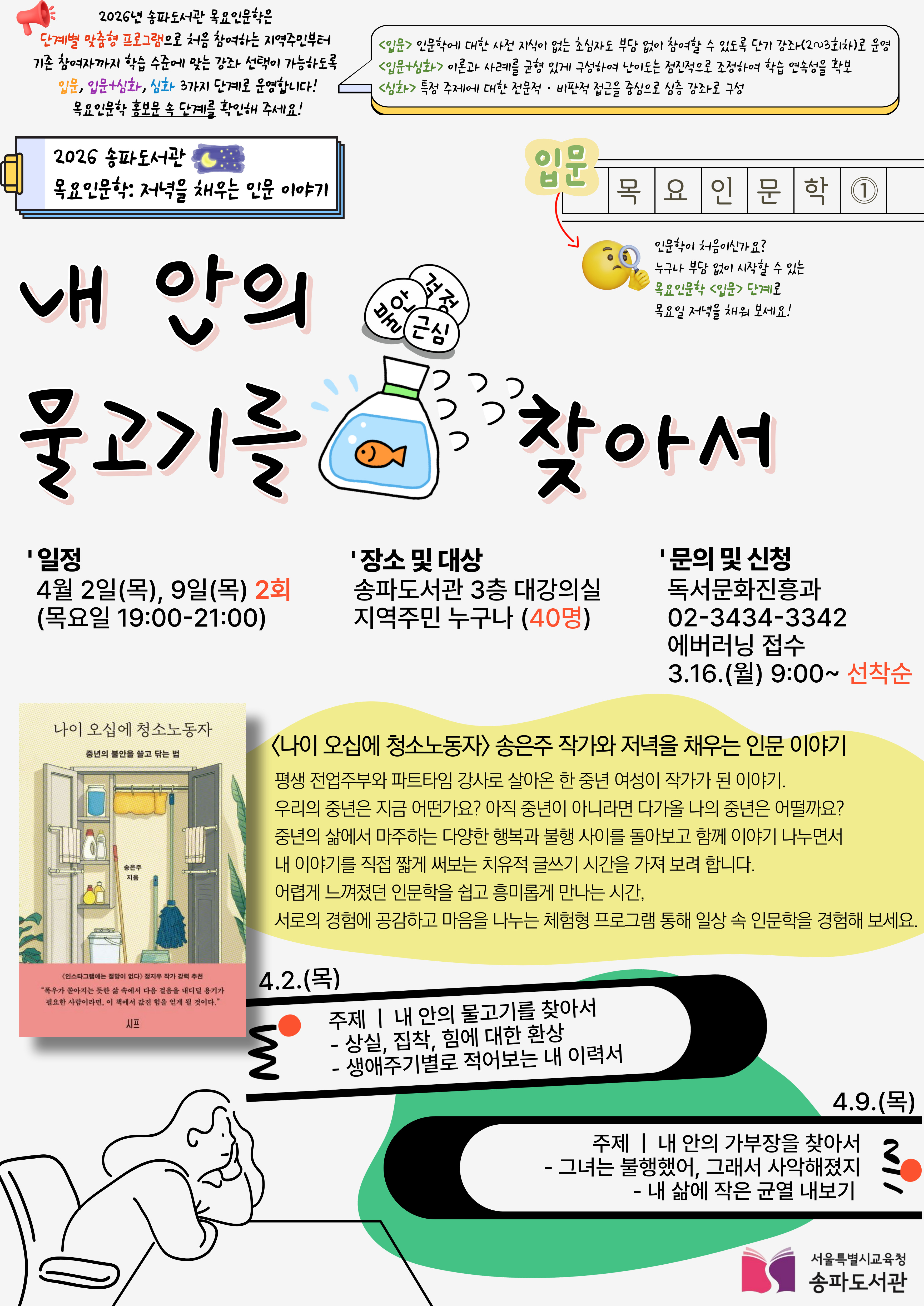 송파도서관 2026년 목요인문학: 저녁을 채우는 인문 이야기 ① 프로그램 안내 ♦ 『나이 오십에 청소 노동자』의 저자, 송은주 작가와 저녁을 채우는 인문 이야기! 관심 있는 분들의 많은 신청 바랍니다. ♦ 접수방법: 에버러닝( everlearning.sen.go.kr ) 온라인 접수 [신청 바로가기] ♦ 접수시작: 2026.3.16.(월) 9시~ 선착순 마감 ♦ 운영일시: 2026.4.2.~4.9.(매주 목) 19:00~21:00 [총 2회] ♦ 운영대상: 대학생, 직장인, 지역주민 등 관심있는 시민 누구나 ( 40명 내외 ) ♦ 운영장소: 대강의실(3층) ♦ 본 강의는 송파도서관에서 진행되는 대면 강의입니다. 착오 없으시기를 바랍니다. ♦ 문의: 독서문화진흥과 사무실(02-3434-3342)