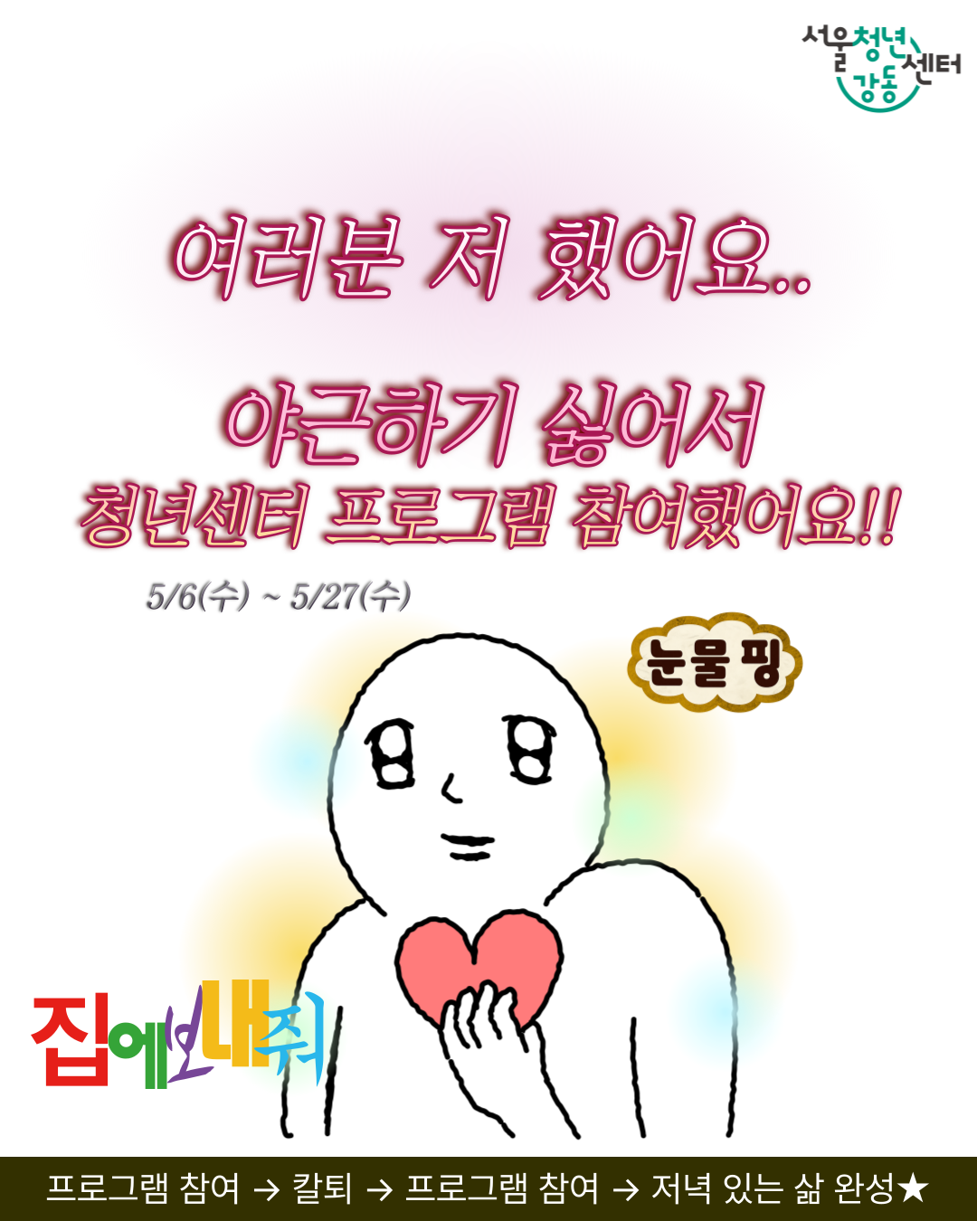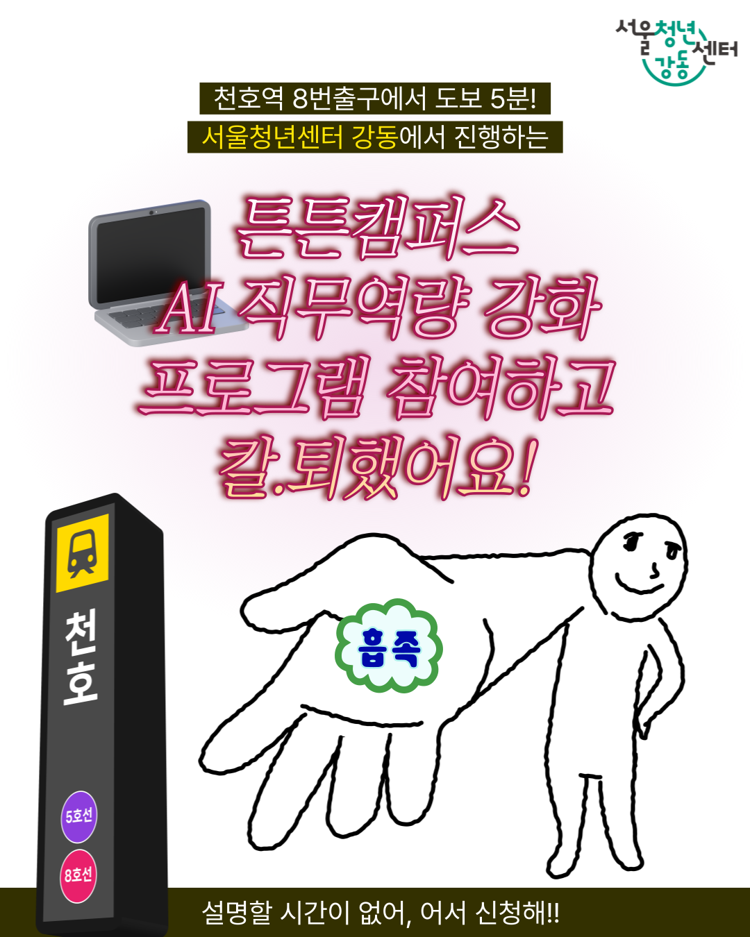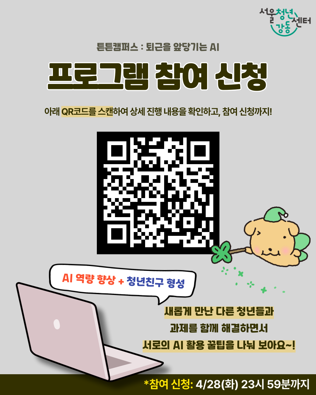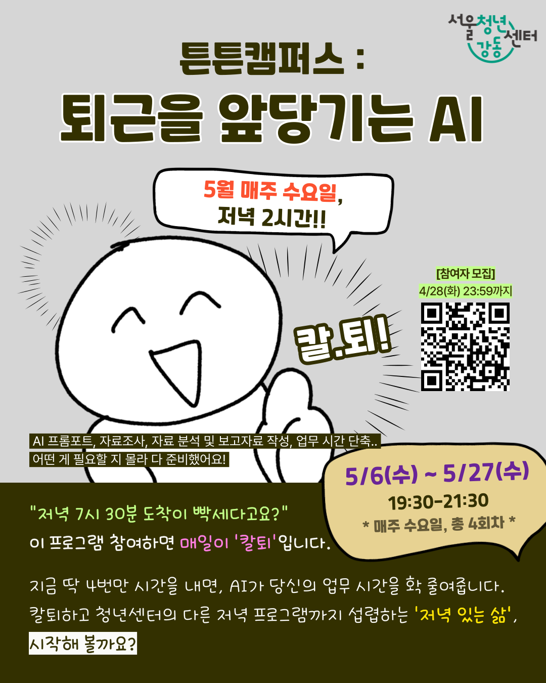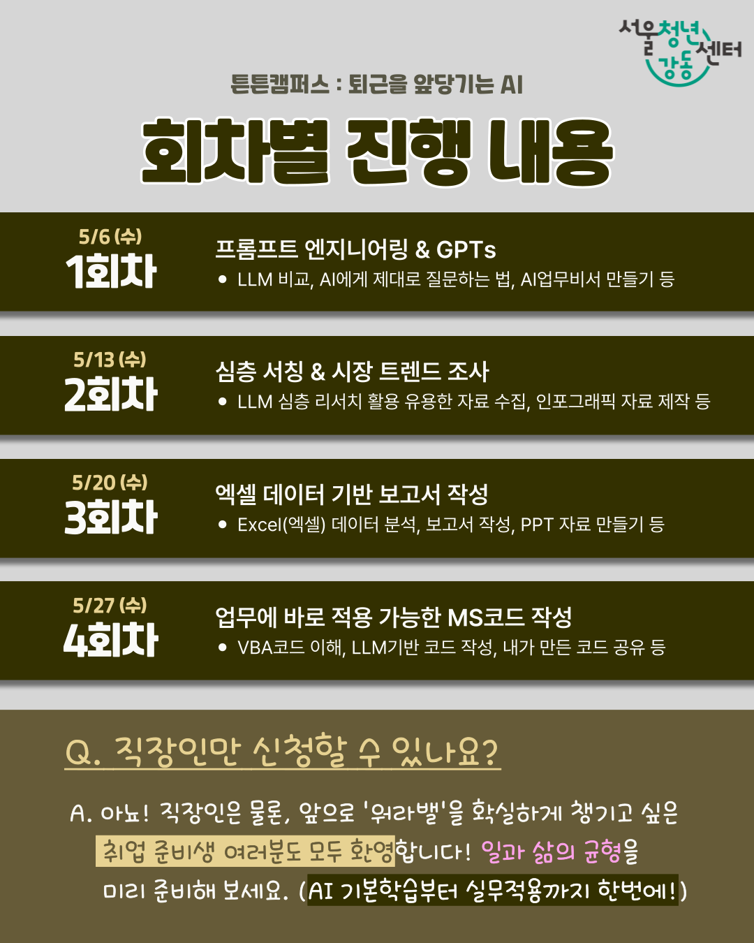 💖직장인, 취업준비생, 대학생 모두 환영해요! <튼튼캠퍼스 : 퇴근을 앞당기는 AI> 프로그램 참여하고, 저녁 있는 삶 누려 보자구요! - - - - - - - - - - - - - - - - - - - - - - 📢 프로그램 소개 'AI 쓰면 칼퇴한다는데... 내 챗GPT는 왜 아직도 단순 검색용일까요? 🤔' AI가 업무 시간을 확 줄여준다는 건 이제 누구나 아는 사실입니다. 문제는 ‘그래서 내 실무에 어떻게 써먹어야 하는지’ 그 진짜 방법을 모른다는 거죠. 남들은 AI로 날아다닌다는데, 막상 켜놓고 뭘 질문해야 할지 막막하셨나요? 스마트한 일잘러의 비결은 트렌드를 아는 것을 넘어, 내 손으로 직접 AI를 다루고 실무에 딱 맞게 세팅하는 것에 있습니다. 서울청년센터 강동 [튼튼캠퍼스] 에서는 수박 겉핥기식 이론이 아닌, 당장 내일 출근해서 써먹을 수 있는 <퇴근을 앞당기는 AI> 실전 활용법 을 준비했습니다! 💨💻 나만의 맞춤형 AI 업무 비서(GPTs) 만들기부터, 막막했던 심층 리서치와 인포그래픽 제작, 엑셀 데이터 분석 기반의 PPT 자동화, 그리고 코딩을 몰라도 챗GPT로 뚝딱 짜서 쓰는 엑셀 VBA 실무 코드까지! 배운 내용을 직접 실습하며 강사님의 꼼꼼한 피드백 을 받고, 조별 과제를 함께 해결하며 새로운 청년 동료들과 자연스럽게 친해지는 네트워킹 은 덤이에요! 🤝 당장의 야근을 줄이고 싶은 직장인도, 완벽한 워라밸을 미리 준비하고 싶은 취준생도 누구나 환영합니다! 🤗 5월, 딱 4번의 수요일 저녁 투자를 통해 'AI를 아는 사람'에서 'AI를 제대로 부리는 사람'으로 거듭나보세요! 😎 - - - - - - - - - - - - - - - - - - - - - - 🗓️ 진행 일정 : 5/6(수) ~ 5/27(수) 매주 수요일 19:30 - 21:30 (총 4회) 📍진행 장소 : 서울청년센터 강동 대강의실 (▶센터 위치 : https://naver.me/G65t6yaX ) - - - - - - - - - - - - - - - - - - - - - - 📚 진행 내용 💗1회차 (5/6 수) : 프롬프트 엔지니어링 & GPTs - LLM 비교, AI에게 제대로 질문하는 법, AI업무비서 만들기 등 - 만들어 본 GPTs 또는 Gems 공유 및 강사 피드백 💗2 회차 (5/13 수) : 심층 서칭 & 시장 트렌드 조사 - LLM 심층 리서치 활용 유용한 자료 수집, 인포그래픽 자료 제작 등 - 만들어 본 인포그래픽 자료 공유 및 강사 피드백 💗3 회차 (5/20 수) : 엑셀 데이터 기반 보고서 작성 - Excel(엑셀) 데이터 분석, 보고서 작성, PPT 자료 만들기 등 - 만들어 본 데이터 기반 PPT 자료 공유 및 강사 피드백 💗4 회차 (5/27 수) : 업무에 바로 적용 가능한 MS코드 작성 - Excel(엑셀) VBA코드 이해, LLM기반 코드 작성, 내가 만든 코드 프로그램에 설치하기 등 - 내가 만든 코드 공유 및 강사 피드백 - - - - - - - - - - - - - - - - - - - - - - 🎯 추천 대상 - 데이터 분석, 시장 트렌드 조사, PPT 제작 등 시간이 오래 걸리는 실무에 치여 칼퇴가 간절한 직장인 청년 - 입사 전부터 일잘러 스킬을 장착하고 싶은 취업준비 청년 - 비슷한 고민을 가진 청년들과 함께 조별 과제를 해결하며 자연스럽고 유쾌하게 네트워킹하고 싶은 분 - 평일 저녁 시간을 유의미하게 보내고 싶은 분 😃 참여자 상세 조건 - (필수) 4/17 공고일 기준, 서울시 거주 만 19세 이상~39세 이하 청년 ※연령연장: 의무복무 제대군인은 복무기간에 비례하여 최대 3세까지 상한 연장 적용 - (필수) 프로그램의 모든 회차에 참여 가능한 청년 - (필수) MS 엑셀, 파워포인트 사용이 가능한 개인 노트북을 지참할 수 있는 청년 - (우대) 사회적 배려대상자 해당 청년 ⭐ 모집 인원 : 20명 이내 - - - - - - - - - - - - - - - - - - - - - - 📆신청 기간 : 4/17(금) ~ 4/28(화) 23:59까지 📌신청 방법 : 이미지 내 QR코드 스캔 또는 하단의 구글폼 링크 접수! https://forms.gle/SUQi4rQLs87wmaxs9 😥노쇼 및 당일 불참은 다른 사람의 참여 기회를 잃게 합니다. 🔔 참여자 선정 : 4/29(수) 오후 중 선정자에 한해 개별 전화 또는 문자 연락 드립니다. (▶전화 : 02-441-9380~3) (▶문자 : 010번호로 문자 연락) 💥 미선정자에게는 별도로 안내해 드리지 않습니다. 💥부재중 등의 사유로 통화가 어려운 경우, 다음 순번 신청자에게 참여 기회를 드릴 수 있습니다. - - - - - - - - - - - - - - - - - - - - - - ✨ 참여 비용 : 무료 💟 참여자 준비물 1) 물 또는 음료 등을 담아 마실 수 있는 개인 텀블러 (센터 내 일회용컵을 사용하지 않습니다) 2) MS 엑셀 및 파워포인트 사용이 가능한 개인 노트북 3) 참여자들과 반갑게 인사하는 열린 마음 4) 궁금한 건 질문하는 적극적 자세 5) 사용한 자리를 깨끗이 정리하는 배려하는 마음 - - - - - - - - - - - - - - - - - - - - - - ✅유의사항 - 이외에 자세한 내용은 구글폼 신청서를 참고해 주세요. 📱 채팅 문의 - 카카오톡 '서울청년센터 강동' 채널을 통해 채팅 문의 가능합니다. ▶ http://pf.kakao.com/_ GQxj Uxb - 문의 시 프로그램명과 참여자분의 성함 을 함께 말씀해 주세요!😀 * 문의 가능 시간 : 월~금 10:00 ~ 22:00 / 토 10:00 ~ 17:00 / 일, 공휴일 휴무