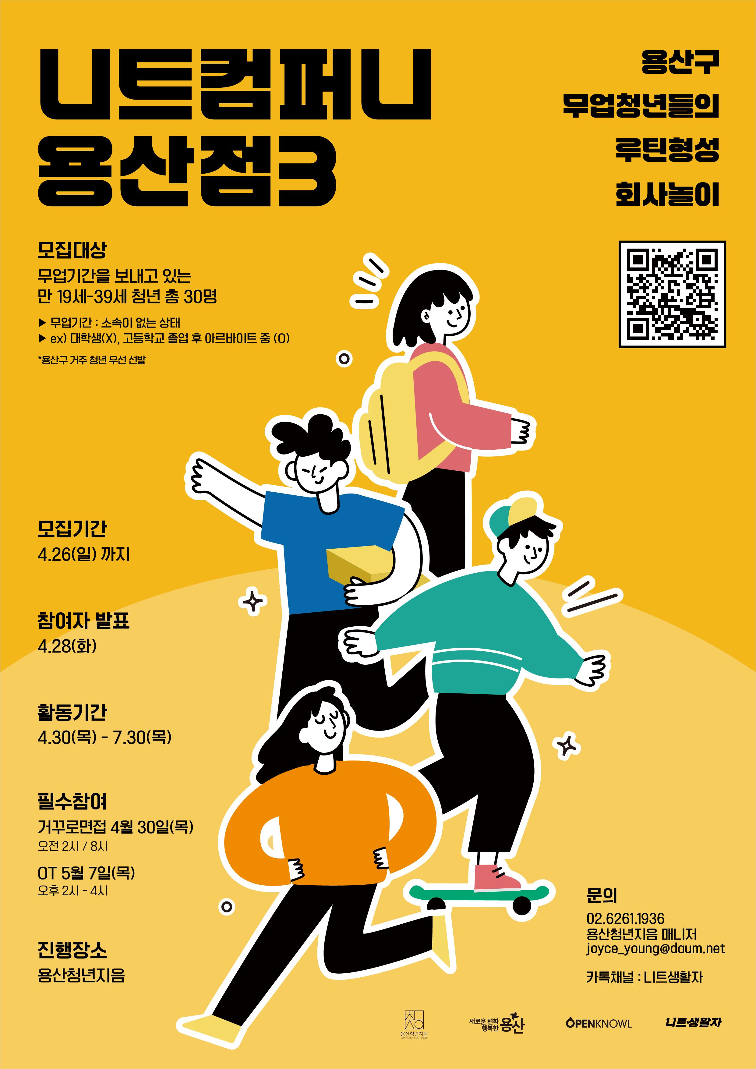 용산 청년지음 <니트컴퍼니 용산점 3기> 운영 및 참여자 모집 무업기간을 보내고 있는 청년들을 대상으로 '니트컴퍼니 용산점 3기'를 운영합니다. 오프라인 출근, 커뮤니티 형성, 구석구석 용산탐험, 내 손으로 만드는 전시 등 다양한 프로그램이 마련되어 있으니 숨고르기 청년들의 많은 관심과 참여 바랍니다. ------------------------------------------------------------------------------------------------------ ○ 모집기간 : 2026. 4. 13.(월) ~ 4. 26.(일) ○ 모집대상 : 현재 무업·무소속 상태인 19세 ~ 39세 청년 (총 30명) (※ 용산구 거주 청년 우선 선발, 대학생은 미대상) ○ 추진내용 : 니트 청년들을 위한 가상 회사 체험 프로그램 운영 - 온·오프라인 출퇴근, 주 5일 업무인증 - 함께하는 사내클럽 및 용산투어 - 무업기간 선배와의 네트워킹 - 나만의 무업기간 전시 활동 ○ 추진장소 : 용산 청년지음 ○ 신청방법 - 포스터 QR코드 또는 아래 미니인턴 링크로 신청 ▶ 신청링크 : https://miniintern.com/event/3145 ○ 참여자 발표 : 2026. 4. 28.(화) 개별연락 예정 ○ 문 의 처 : 02-6261-1936 (용산 청년지음)
