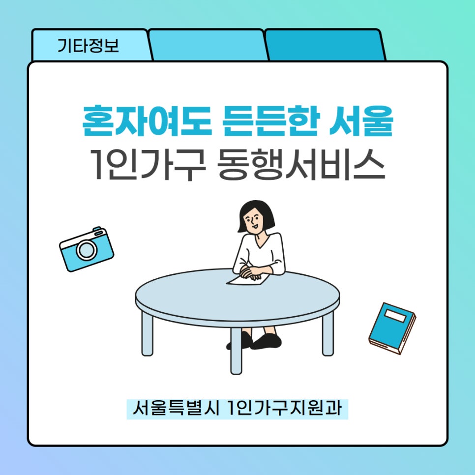 서울시 1인가구 동행서비스 혼자여도 든든한 서울 생활, 동행매니저가 함께합니다♥️ 서울시 거주 1인 가구를 위한 건강·이사·마음동행 통합서비스를 이용해 보세요!😻 지원대상 및 지원내용 구분 건강동행서비스 이사동행서비스 마음동행서비스 지원대상 몸이 아파 혼자서 병원·약국·재활센터·건강검진 등에 방문하기 어려운 1인 가구* 서울소재 병원 및 서울시 거주자만 가능* 1인가구를 원...