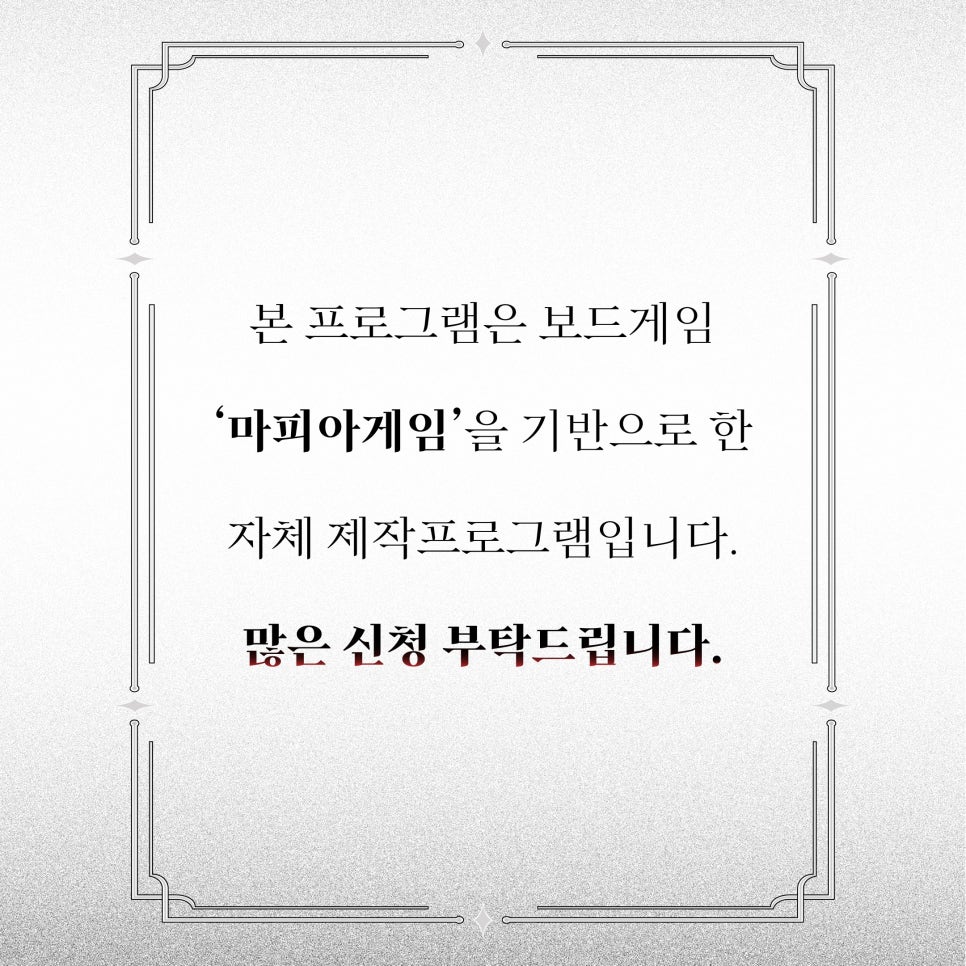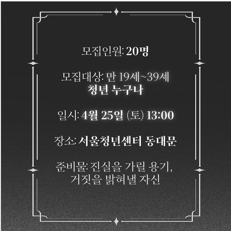 “의심하고, 속이고, 살아남아라! ” 낯선 사람들 사이에서 펼쳐지는 치열한 익명 심리 추리극, 거짓주파수에 당신을 초대합니다. 이곳에서는 이름, 나이, 직업 모두 내려놓고, 오직 '새로운 이름'과 '생존 미션'만이 주어집니다. 천사: 눈앞의 거짓을 꿰뚫고 진실을 찾아내세요. 악마: 완벽한 연기로 모두를 속이고 끝까지 살아남으세요. ⚠️ "여기선 죽어도 끝나지 않습니다." 탈락자는 '지옥'으로 이동하여 보이지 않는 손이 되어 게임의 판도를 뒤흔듭니다. 끝까지 방심할 수 없는 몰입형 심리게임, 당신은 진실을 찾을 수 있나요? 👉 이런 분들께 추천합니다 💀 새로운 사람들과 평소에 하기 힘든 짜릿한 심리전을 즐기고 싶은 분 💀 심리전, 추리, 마피아 게임 좋아하는 분 💀 탈락하고 구경만 하는 마피아 게임이 아쉬웠던 분 ------------------------------ ⚔️장소 서울청년센터 동대문(서울시 동대문구 회기로 165, 회기역 1번출구에서 도보 5분) 🕒 일시 2026.4.25.(토) 13:00~17:00 ※ 게임특성 상 종료시간이 늘어날 수 있습니다. ※ 센터 공사 상황에 따라 일정이 2026.5.1.(토) 13시로 변경될 수 있습니다. → 아래 신청서 작성하실 때, 대체 일정 참여 가능 여부를 꼭 체크해주세요. → 확실한 일정은 4월 18일(토) '서울청년센터 동대문 인스타그램'에 공지됩니다. 양해해주셔서 감사합니다. 🏴☠️ 참가비 무료 🐍신청기한 2026.4.15.(수) 16시까지 ※ 선정자에 한해 4.16.(목) 17시 개별 문자 안내 🔥모집인원 20명 내외 🎁 선물 다과 제공, VIP에게 소정의 선물 👽 문의 070-4112-1753 🌸 신청방법 아래 구글폼 작성 https://forms.gle/fSWcp898wDJAPHPL7