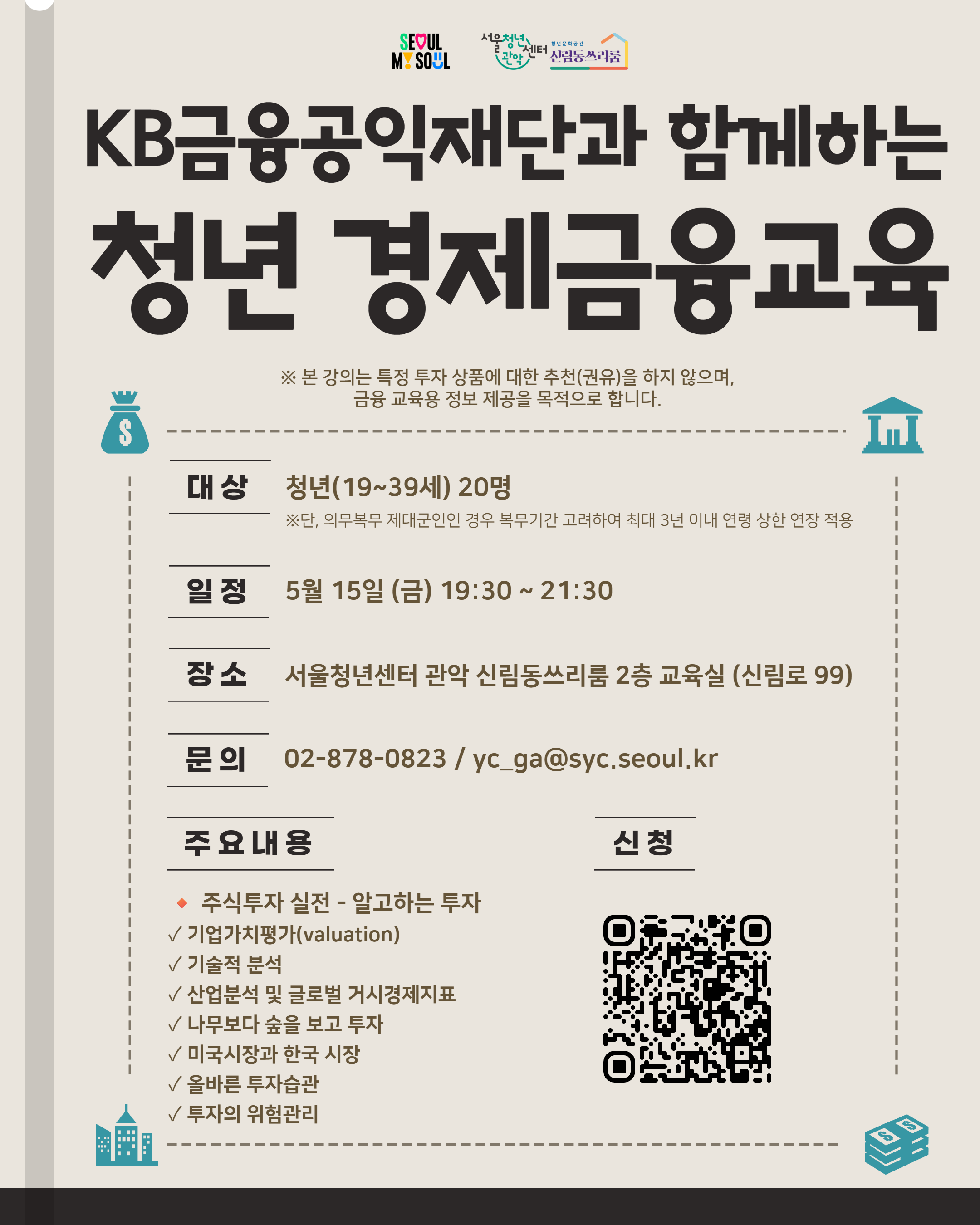 안녕하세요, 서울청년센터 관악 신림동쓰리룸입니다 :) KB금융공익재단과 함께하는 청년을 위한 경제금융교육 많은 신청 부탁드립니다! - 내용 : ✔️주식투자 실전 - 알고하는 투자 🔸기업가치평가(valuation) 🔸기술적 분석 🔸산업분석 및 글로벌 거시경제지표 🔸나무보다 숲을 보고 투자 🔸미국시장과 한국시장 🔸올바른 투자습관 🔸투자의 위험관리 ※ 본 강의는 특정 투자 상품에 대한 추천(권유)을 하지 않으며, 금융 교육용 정보 제공을 목적으로 합니다. - 일시 : 2026년 5월 15일(금) 19:30~21:30 - 대상 : 청년(19세~39세) 20명 ※단, 의무복무 제대군인인 경우 복무기간 고려하여 최대 3년 이내 연령 상한 연장 적용 (증빙 요청) ‣ 2년 이상의 복무기간을 마치고 전역한 제대군인 : 3세 가산 (~만 42세) ‣ 1년 이상 2년 미만의 복무기간을 마치고 전역한 제대군인 : 2세 가산 (~만 41세) ‣ 1년 미만의 복무기간을 마치고 전역한 제대군인 : 1세 가산 (~만 40세) - 장소 : 서울청년센터 관악 신림동쓰리룸 2층 교육실 (신림로 99, 센터스퀘어 서울대점 내 청년활력공간 2층) - 신청 및 선정 ** 신청기간 완료 후 선정기준에 따라 참여자 선정 진행 (선정과정 중 참석확인 문자 회신 필수) ** 신청인원이 모집정원의 2배수 이상을 초과할 경우, 신청을 조기종료할 수 있습니다. ** 선정자에게 개별 연락 예정 ** 신청 취소 및 불참 시 최소 1일 전 유선 연락 필수 - 비용 : 무료 - 링크 : https://youth.seoul.go.kr/youngtech/cls/list/108 - 문의 : 02-878-0823 / yc_ga@syc.seoul.kr - 참여자 선정 기준 1. 19~39세 이하 청년 여부 ※ 단, 의무복무 제대군인인 경우 복무기간 고려하여 최대 3년 이내 연령 상한 적용 - 2년 이상의 복무기간을 마치고 전역한 제대군인 : 3세 가산(~42세) - 1년 이상 2년 미만의 복무기간을 마치고 전역한 제대군인 : 2세 가산(~41세) - 1년 미만의 복무기간을 마치고 전역한 제대군인 : 1세 가산(~40세) 2. 청년몽땅정보통 관악센터 멤버십(선호 지역청년센터 '관악' 선택) 회원가입 여부 ** (청년몽땅정보통 가입 -> 마이페이지 -> 알림설정 -> 선호 지역청년센터 '관악' 선택) 3. 과거 1년 이내 프로그램 참여 경험이 적은 신청자 (프로그램 최초 참여 우대) 4. 프로그램 신청 순서 5. 프로그램 참석률 ** 프로그램 선정 후 신청자 정보 확인을 위한 추가 자료를 요청할 수 있으니 참고 바랍니다. ** 과거 6개월 내 2회 이상 프로그램에 불출석할 경우, 불출석한 프로그램 종료일로부터 향후 3개월 간 프로그램 선정에서 제외될 수 있습니다. 일정 확인 후 프로그램 신청 부탁드리겠습니다. 🔸 서울청년센터 관악 신림동쓰리룸 멤버십 가입 방법 바로가기 : https://blog.naver.com/sillim3room/223073639730