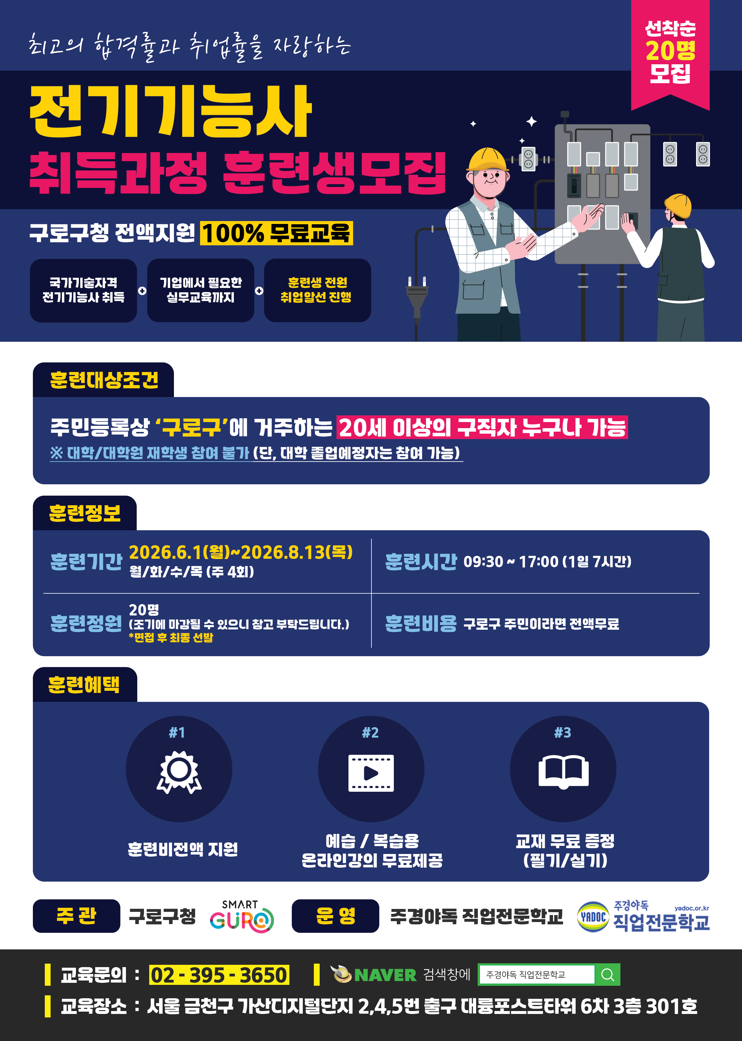 구로구에서는 구로구민의 안정적인 일자리 창출에 기여하고자 전문기술인력(전기기능사 자격 취득 및 취업연계) 양성사업을 실시하오니 관심있는 주민들의 많은 참여 바랍니다. ○ 접수기간: 2026. 4. 13.(월) ~ 5. 29.(금) ○ 교육기간: 2026. 6. 1.(월) ~ 8. 13. (변동가능/ 평일 월~목, 1일 7시간 교육) ○ 모집대상: 전기관련분야 취...