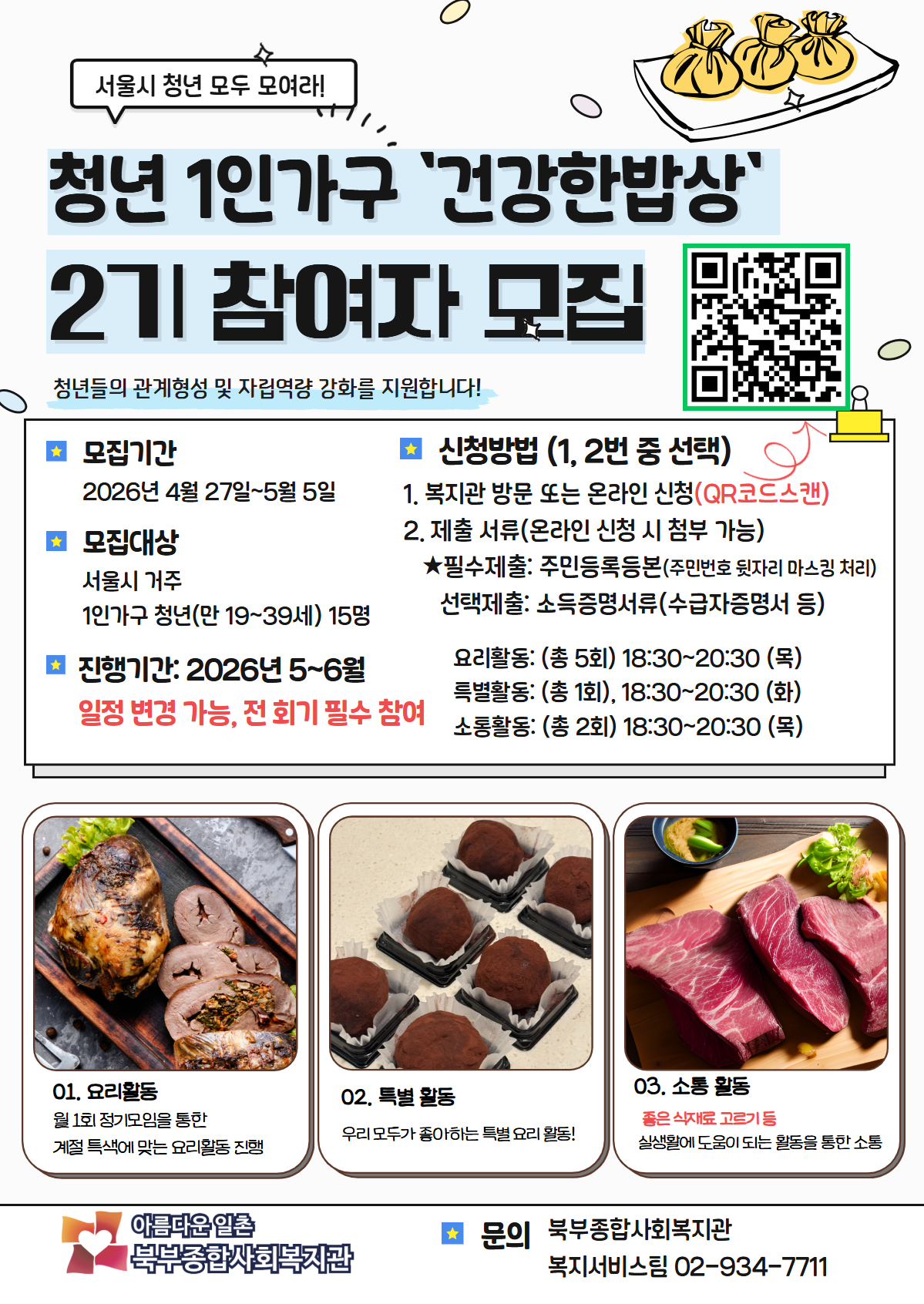 북부종합사회복지관 < 청년 1인가구 '건강한 밥상' 2기 모집> [청년 1인가구 '건강한 밥상' 2기 모집 개요] - 모집 대상: 서울시 거주 1인가구 청년(만 19~39세) 총 15명 (※ 예비 1인가구 포함, 저소득 청년 우선 선발) - 모집 기간: 2026년 4월 27일 ~ 5월 5일 - 진행 기간: 2026년 5월 ~ 6월 중 (매주 화요일 또는 목요일 18:30~20:30) - 주요 활동: (※ 원활한 관계 형성을 위해 전 회기 필수 참여) • 요리 활동 (5회): 매주 1회 계절 특색에 맞는 요리 만들기 • 특별 활동 (1회): 테마가 있는 특별 요리 활동 • 소통 활동 (2회): 좋은 식재료 고르는 법 등 실생활 팁 교류 - 참여 절차: 신청 접수 ➔ 서류 제출(주민등록등본 등) ➔ 온라인 척도 검사 ➔ 최종 선정 - 문의: 북부종합사회복지관 복지서비스팀 (02-934-7711)
