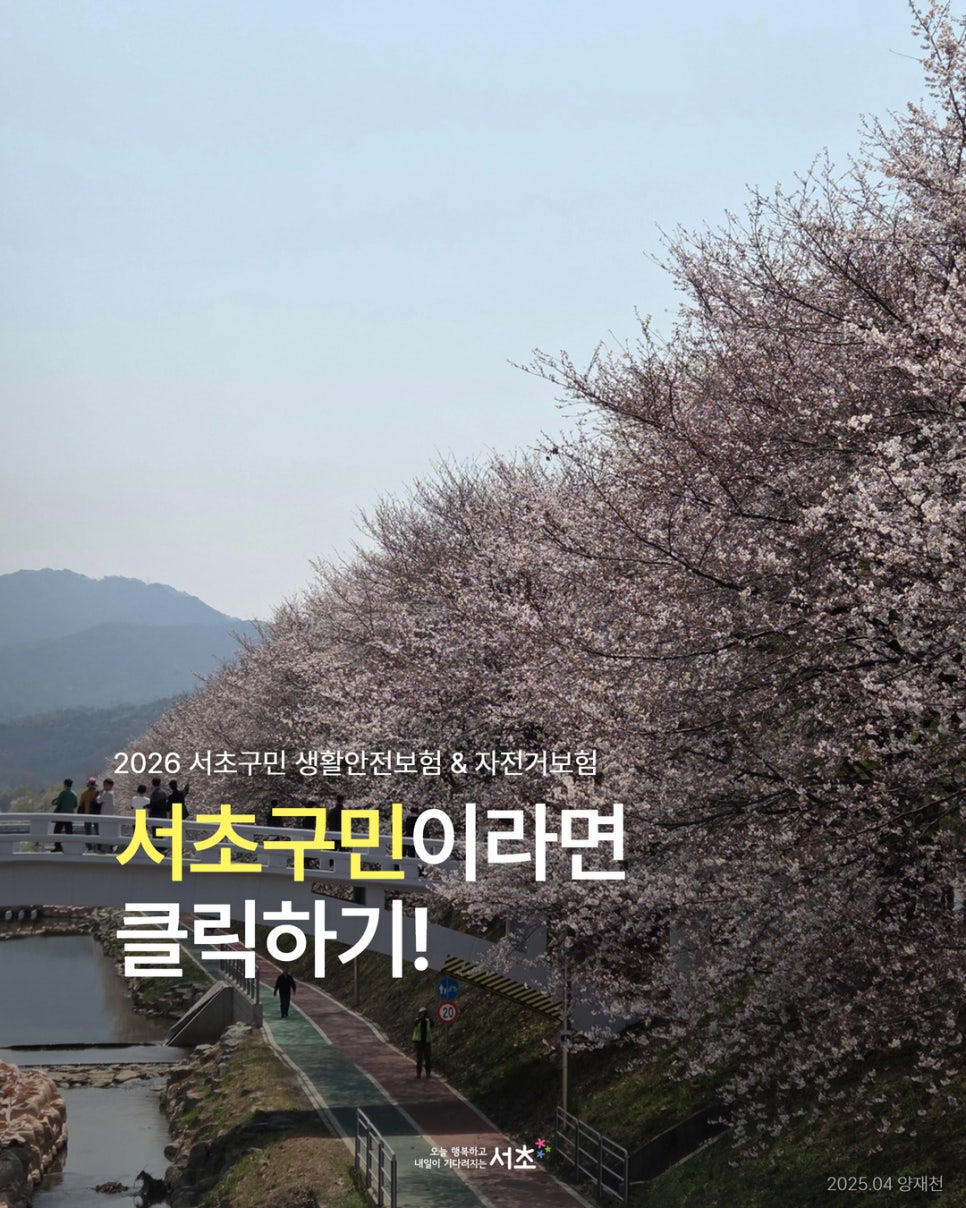 혹시 모를 사고나 재난, 너무 걱정하지 마세요.🙂 '생활안전보험'과 '자전거보험'이 별도 신청 없이 자동 가입되어 있습니다! 따로 신청 안 해도 전국 어디서든 보장된다는 점👍 필요한 순간 든든한 지원이 되어드립니다.💗 <2026 서초구민 생활안전보험> ⭐보장기간 : 2026.2.1.~ 2027.1.31. ※보험청구 소멸기간 : 사고일로부터 3년 ⭐피보험자 : 서초구...