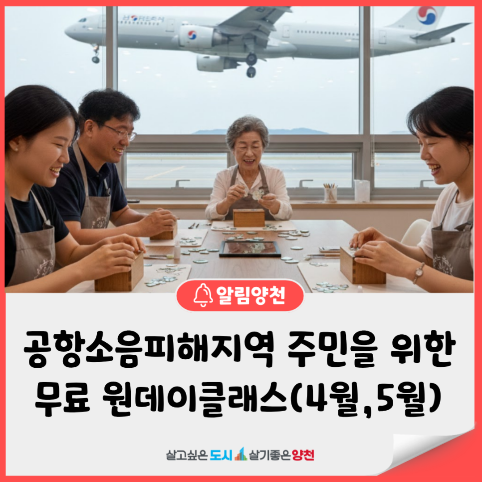 🛫 비행기 소음은 잠시 OFF, 감성은 ON! 공항소음 피해지역 주민들을 위한 힐링 공예 원데이 클래스가 4, 5월 모집을 시작합니다! 관심 있는 구민 여러분의 많은 참여 바랍니다! 😊 **신청대상** 양천구 공항소음 대책지역 거주 주민 등 **신청기간** 2026. 3. 10.(화) 10시 ~ 접수순 마감까지 **모집인원** 회차별 15명 (수강료 무료) * 정원 초과 시 접수 순 마감 **수업일시** 2026. 4. ...