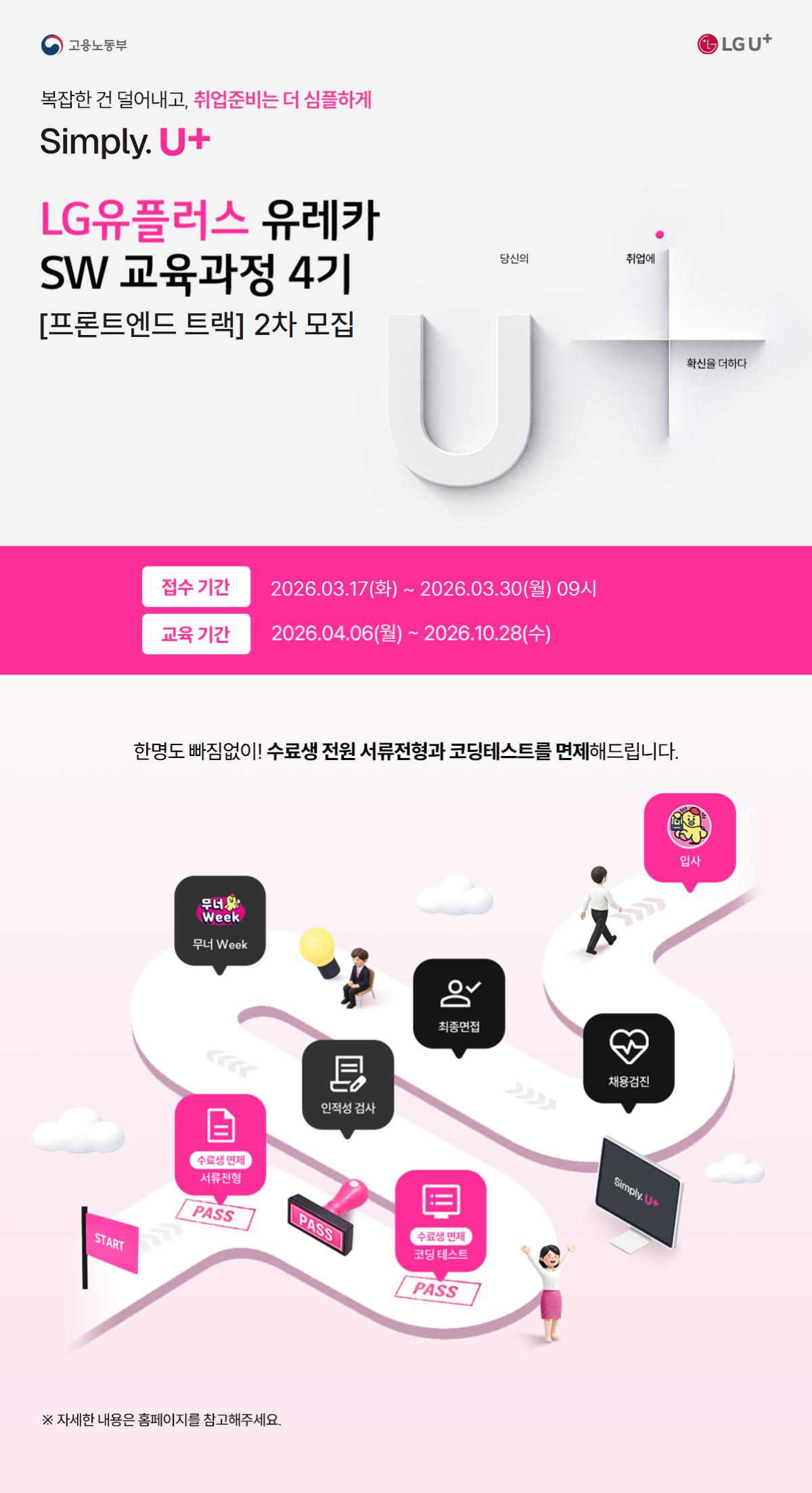 안녕하세요. LG U+ 유레카 4기 운영사무국입니다. LG U+ 유레카 SW교육과정은 미래 IT 인재를 발굴하고 육성하기 위해 LG유플러스가 준비한 교육과정입니다. 실무 요구가 반영된 커리큘럼을 바탕으로 프론트엔드와 백엔드가 함께하는 융합 프로젝트를 통해 실전 감각을 키울 수 있으며, LG유플러스 현직자 멘토링을 통해 현장 중심의 전문성을 쌓은 인재로 성장할 수 있는 기회를 제공합니다. LG U+ 유레카 4기는 현재 융합 프로젝트에서의 팀 밸런스를 맞추기 위해 프론트엔드 트랙 참여자를 추가 모집하고 있으니 많은 관심과 참여를 부탁드립니다. 취업 준비는 Simple해지고, 혜택은 Plus되는 LG U+ 유레카 4기와 함께 기업이 원하는 신입으로 성장해 보세요! ■ LG U+ 유레카 4기 수강생 혜택 ① Simple해지는 취업 준비 - 기술교육부터 프로젝트까지 한 번에 해결되는 커리큘럼 - 서류+코딩테스트 면제로 더욱 간단해지는 채용 프로세스 - 대면·비대면 중 원하는 방식대로 Simple하게! ② Plus되는 혜택 - LG U+ 현직자와 함께 기술 멘토링 및 네트워킹 - LG U+ 테크컨퍼런스 ‘유플텍플’ 초대 - LG U+ 연계 융합 프로젝트 경험으로 포트폴리오 경쟁력 Plus! ■ 신청 대상 - 대한민국 국적의 구직자이며, 국민내일배움카드 소지자 ■ 신청 기간 2026.03.17(화) ~ 2026.03.30(월) 09시까지 ※ 접수기간은 일부 변동될 수 있습니다. ■ 모집 인원 • 프론트엔드 개발자 : 대면 30명, 비대면 30명 ■ 진행 내용 IT인재 양성을 위한 프론트엔드,백엔드 교육 (융합 프로젝트 활동 시 팀 밸런스를 위하여 프론트엔드 과정만 추가 모집) ① LG 유플러스 유레카 프론트엔드 커리큘럼 요약 - Javascript 기반의 프로그램 학습 - React Framework의 핵심 개념 모듈 이해를 기반으로 한 간편한 웹 애플리케이션 개발 학습 - 프론트엔드 개발자가 백엔드의 개발 방식을 이해하여 협업과 문제해결 역량 강화 - 웹 Security 개념 및 웹 애플리케이션 취약점에 대한 이해 프로젝트를 위한 애자일 방법론 습득 및 학습 활용 ■ 진행 일시 2026.04.06(월) ~ 2026.10.28(수) ※ 단, 종료일은 일부 변동될 수 있음. 월~금 09시~18시 | 총 135일, 1080시간 [대면] 서울시 강남구 선릉로 428, 멀티캠퍼스 선릉 [비대면] 실시간 비대면 강의(Zoom) ■ 신청 방법 신청 기간 내 하단 링크를 통해 지원서 제출 ▶ 신청 바로 가기 : https://buly.kr/EI4wPQw ■ 수업 관련 문의 카카오톡 1:1 상담 | LG 유플러스 유레카 ■ 수료생 후기 보기 LG U+ 유레카 프론트엔드 트랙 수강생 후기 : https://blog.naver.com/multicampus_it/224214119940