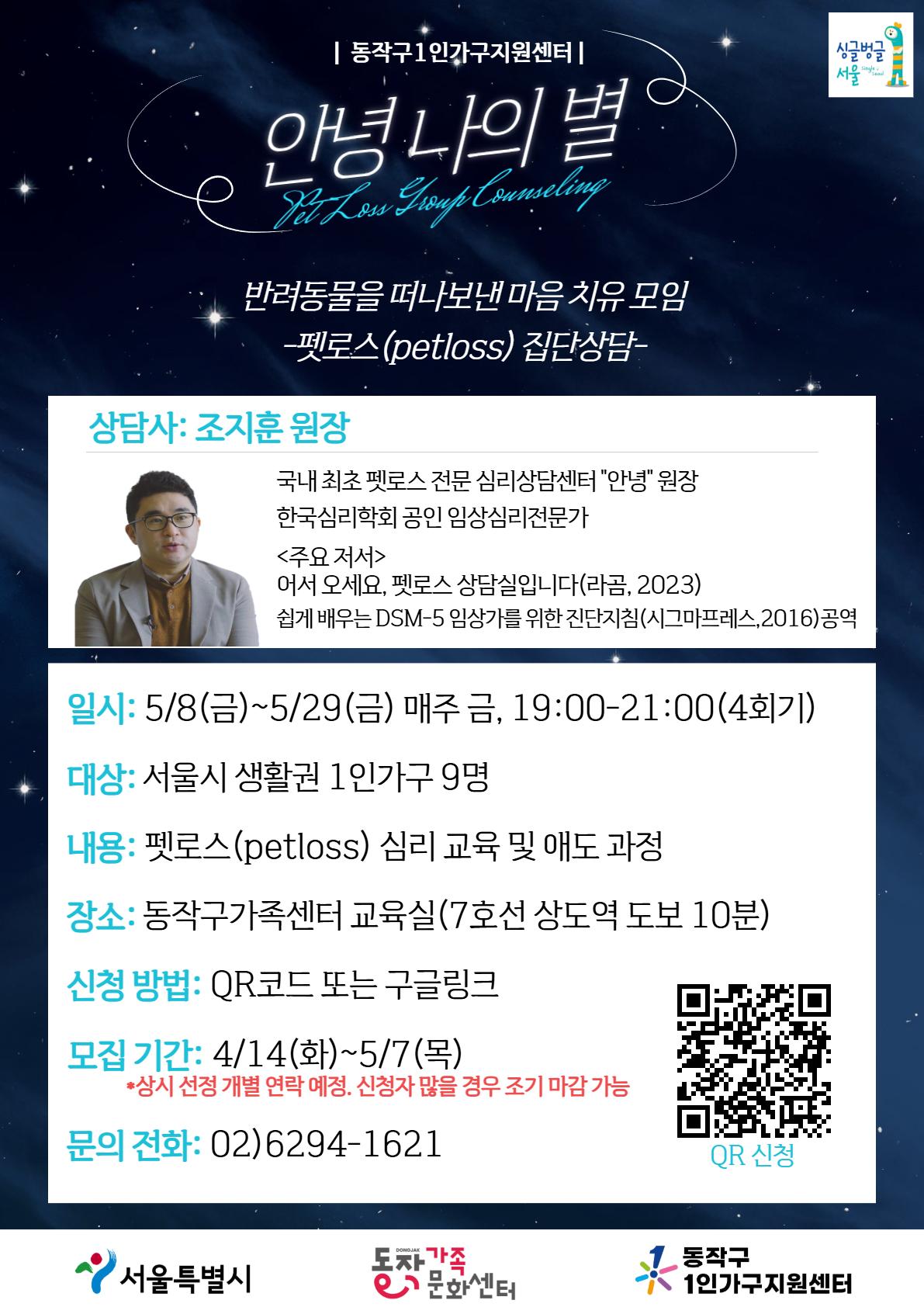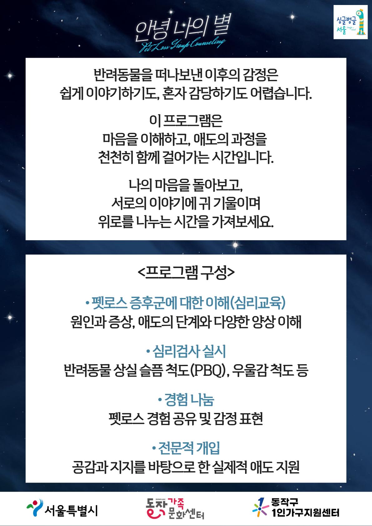 안녕하세요. 동작구1인가구지원센터입니다. 반려동물을 떠나보낸 이후의 감정을 혼자서 정리하기 어려운 분들을 위해 펫로스 프로그램을 진행합니다. 본 프로그램은 심리교육과 참여자 간 나눔을 통해 펫로스에 대한 이해를 돕고, 애도의 과정을 차분하게 정리할 수 있도록 구성되어 있습니다. 비슷한 경험을 가진 분들과 함께 각자의 속도에 맞춰 마음을 돌아보는 시간을 가져보시기 바랍니다. [프로그램 개요] ● 일정: 5/8(금) ~ 5/29(금) 매주 금 19:00~21:00 ● 대상: 서울시 생활권 1인가구 9명 ● 내용: 펫로스 심리교육 및 애도 과정 ● 장소: 동작구가족센터 4층 교육실 ● 문의전화: 02-6294-1621(펫로스 프로그램 담당자)