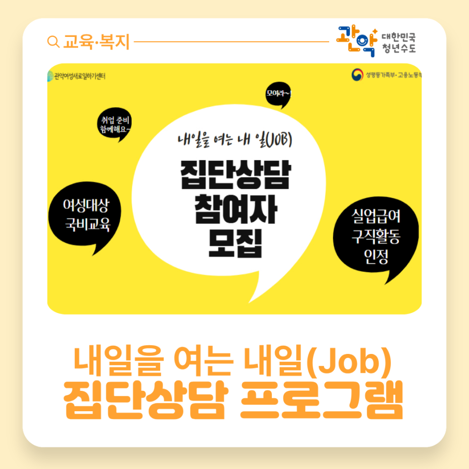 관악여성인력개발센터에서 여성 구직자들을 위한 집단상담 프로그램을 운영합니다. 실제 취업에 도움 되는 알찬 내용으로 구성된 이번 교육은 실업급여 구직활동으로도 인정되며 전액 국비 지원으로 부담 없이 참여하실 수 있어요. 취업 준비 중이신 여성분들의 많은 관심과 참여 기다립니다! ✅참여대상: 취·창업, 이·전직 등 경제활동을 희망하는 모든 여성 ✅ 교육내용: 직업선호도검사(...