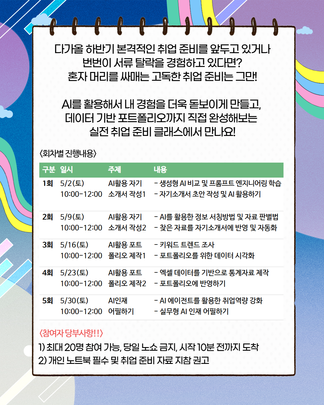 🌞 취업·이직 준비생 주목!! 자기소개서 심폐소생 & AI 포트폴리오 제작을 돕습니다!! 🌞 "자소서 첫 줄 쓰기가 제일 막막해요..." "포트폴리오는 대체 어디서부터 손대야 하죠?" 본격적인 취업 준비, 어떻게 하고 계신가요? '자격증만 취득하면 해야지', '대외활동만 끝나면 해야지, 해야지...' 하고 생각만 미루고 계셨던 분들, 혹은 번번한 서류 탈락 경험으로 취업과 이직 준비에 지친 분들을 위해 5월 토요성장클래스가 준비했습니다. 🛠 5월의 주제 : <자기소개서 심폐소생 & AI 포트폴리오 제작 편> 혼자 끙끙 앓던 취업과 이직 준비, 이제 든든한 파트너 '생성형 AI'와 원팀(One-Team)이 되어 스마트하게 해결하세요! 단순히 챗GPT에 질문 몇 번 던져보는 수준이 아닙니다. AI 프롬프트 엔지니어링을 통해 내 경험을 120% 돋보이게 만들고, 데이터 기반의 트렌디한 포트폴리오까지 내 손으로 직접 완성해보는 실전 압축 클래스입니다. 막막했던 취업의 문, AI라는 강력한 무기로 시원하게 뚫어보자고요! ✨ ⚠️ 신청 전 꼭 확인해 주세요! (유의사항 및 준비물) -👨🏫 진행 강사: 본 프로그램은 취업 전문 컨설턴트가 아닌 'AI 교육 분야 전문 강사'님이 진행합니다. -💡 수업 방향: 따라서 인사담당자 관점의 1:1 정밀 서류 첨삭이 목적이 아닙니다. "AI라는 도구를 활용해 내 손으로 직접 서류 퀄리티를 높이고, 실무 AI 활용 역량을 키우는 것"이 핵심 목표입니다. 스스로 AI를 다루는 힘을 기르고 싶은 분들께 최적화되어 있습니다. -💻 필수 준비물: 개인 노트북 및 개인 취업 준비 자료 (기존 자기소개서 초안, 포트폴리오 초안 등. 완벽하지 않아도 괜찮으니 편하게 가져오세요!) 🌱 <토요 성장 클래스>는? 매주 토요일, 청년의 성장을 돕는 알짜배기 특강! 그냥 앉아서 듣기만 하는 지루한 수업은 NO! 🙅♀️ 이론+실습으로 꽉 채운 2시간 동안, 전문 강사님께 궁금한 내용들을 물어보며 '내 것' 으로 만들어가는 시간입니다:) 🙋♀️ 1. 추천 대상 - (필수) 4/3 공고일 기준, 만 19세 이상~39세 이하 청년 ※연령연장: 의무복무 제대군인은 복무기간에 비례하여 최대 3세까지 상한 연장 적용 - (필수) 프로그램의 모든 회차에 참여 가능한 청년 - 빈 모니터만 보면 한숨 쉬는 취업,이직 준비생 (첫 취준, 이직 모두 환영해요!) - 기존에 작성한 밋밋한 자소서를 합격률 높은 자소서로 '심폐소생' 하고 싶은 청년 - 포트폴리오가 아예 없거나, 데이터를 활용해 전문성을 더하고 싶은 청년 - 채용 공고 속 'AI 활용 가능자 우대' 문구를 나의 핵심 무기로 만들고 싶은 청년 등 ⏰ 2. 회차별 커리큘럼 및 진행장소 1회차 AI활용 자기소개서 작성1 - 일시 : 5/2(토) 10:00-12:00 - 내용 : 생성형 AI(ChatGPT, Gemini 등) 비교 & 내 경험으로 자소서 초안 뽑아내기 등 2회차 AI활용 자기소개서 작성2 - 일시 : 5/9(토) 10:00-12:00 - 내용 : AI 정보 서칭 & Gems를 활용한 자소서 작성 자동화 등 3회차 AI활용 포트폴리오 제작1 - 일시 : 5/16(토) 10:00-12:00 - 내용 : 키워드 트렌드 조사 & 포트폴리오를 위한 데이터 시각화 기초 등 4회차 AI활용 포트폴리오 제작2 - 일시 : 5/23(토) 10:00-12:00 - 내용 : 엑셀 데이터 통계 변환 & 포트폴리오에 통계 수치 녹여내기 등 5회차 AI 인재 어필하기 - 일시 : 5/30(토) 10:00-12:00 - 내용 : 나만의 AI 에이전트(Agent) 구축 & 실무형 'AI 인재'로 어필하기 등 - 장소(공통): 서울청년센터 강동 대강의실 (▶센터 위치 : https://naver.me/G65t6yaX ) 💛신청 방법 https://forms.gle/FcWXoMZVbdoYSLkk8 📆신청 기간 : 4/3(금) ~ 4/26(일) 23:59까지 🔔 참여자 선정 : 4/27(월) 오후 중 선정자에 한해 문자 연락 드립니다. (▶문자 : 010번호로 문자 연락) 💥미선정자에게는 별도로 안내해 드리지 않습니다. 💥부재중 등의 사유로 통화가 어려운 경우, 다음 순번 신청자에게 참여 기회를 드릴 수 있습니다.