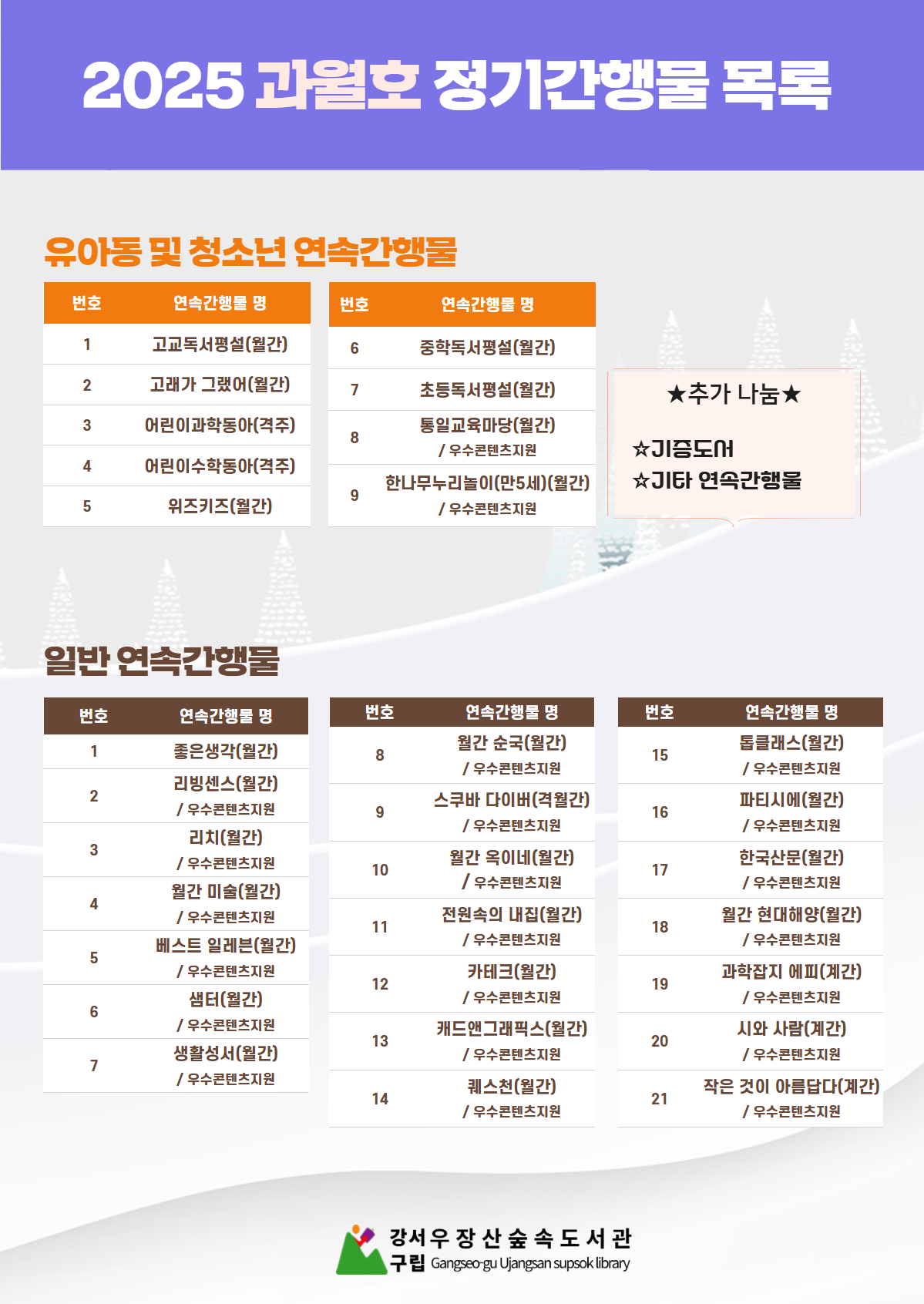 강서구립우장산숲속도서관에서 과월호 잡지를 무료로 나눠주는 행사를 한대, 필요한 거 있으면 얼른 가봐!