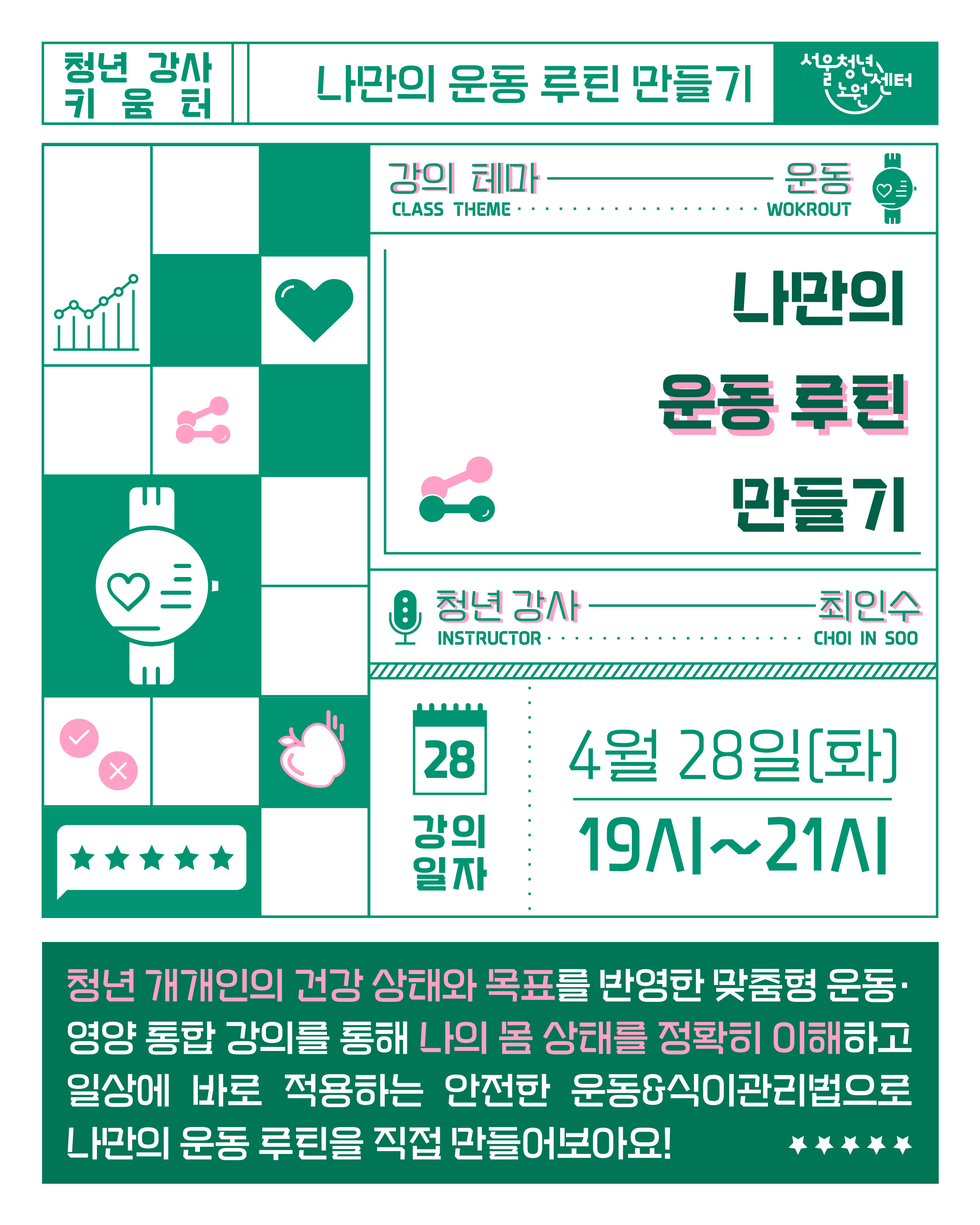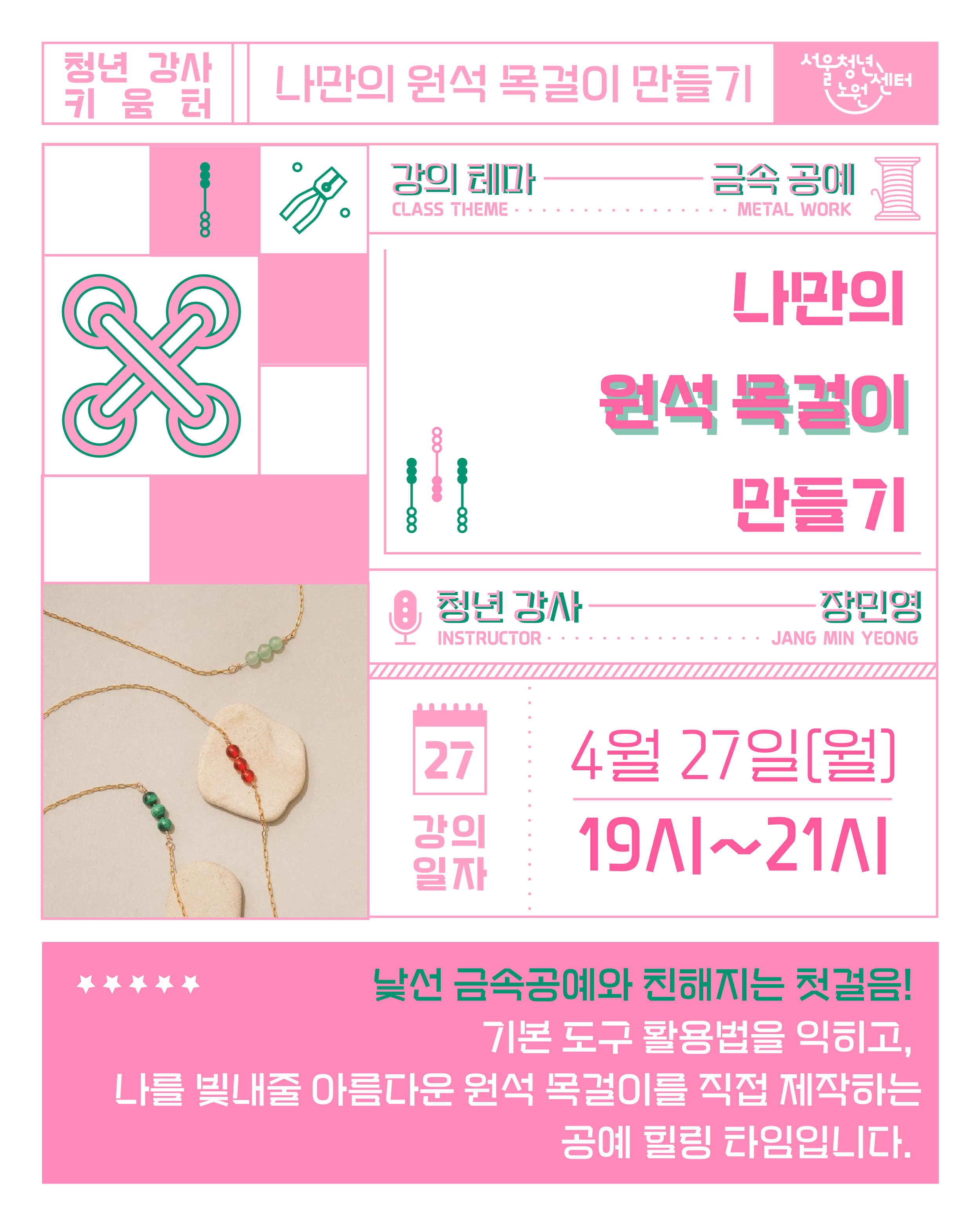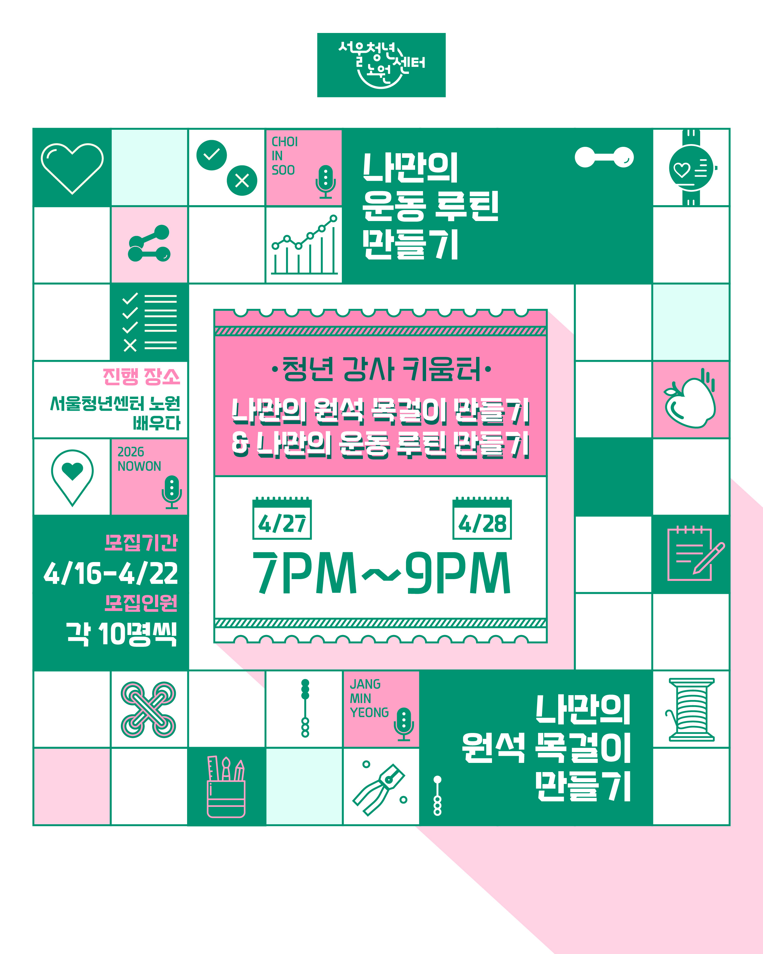 [서울청년센터노원] 청년 강사 키움터 4월 클래스 참여자 모집 여러분의 소중한 투표 한 표, 한 표가 모여 드디어 문을 엽니다! 청동이들이 직접 고른 주제로 꽉 채운 [청년 강사 키움터] 그 대망의 첫 번째 라인업! Pick 1. [공예] 나만의 원석 목걸이 만들기 💎 Pick 2. [운동] 나만의 운동 루틴 만들기 🏃♂️ 이거 내가 투표했던 건데! 하시는 분들 손? 🙋♀️🙋♂️ 내 투표로 만들어진 첫 번째 '청년 강사 키움터', 그 시작을 함께 응원하고 즐겨주세요! 🍋 진행일시 - 4월 27일(월), 4월 28일(화) 19:00~21:00 ✔ 다른 강의이므로 중복 신청 가능합니다. ✔ 🍋 장소 - 서울청년센터 노원 배우다 (서울 노원구 동일로 1405, 9층 서울청년센터 노원) 🍋 모집인원 : 20명 (*회차별 각 10명, 추첨하여 선정) 🍋 모집기간 - 4월 16일(목) ~ 4월 22일(수) 23:59 까지 (*선정자는 4월 23일(목) 개별 발표) 🍋 모집대상 - 서울시 공공서비스 예약 홈페이지를 가입한 청년(만 19세~39세)이라면 누구나 🍋 신청 방법 - 서울시 공공서비스 예약 홈페이지에서 인증 후 신청 (*링크 : https://yeyak.seoul.go.kr/web/reservation/selectReservView.do?rsv_svc_id=S260417100443853675&locale=ko ) 🍋 문의 - 070-8887-8118 (해리 매니저) 📍안내사항 - 참여가 어려우실 경우 다른 청년에게 기회를 드릴 수 있도록 프로그램 3일 전까지 담당 매니저에게 전화로 연락해 주세요. (문자 불가) ※ 주말·공휴일 제외, 센터 운영일(평일) 기준 - 프로그램 시작 2일 전~당일까지 취소하거나, 사전 연락 없이 불참하는 경우 ‘노쇼’로 간주됩니다. - 노쇼 발생 시 3개월간 프로그램 참여가 제한됩니다. - 프로그램 시작 후 20분 이상 지각 시 참여가 제한됩니다.