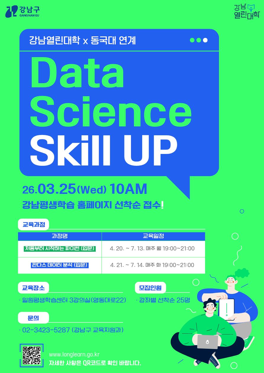 데이터 분석한 번쯤 도전해보고 싶으셨나요? 강남열린대학과 동국대학교가 함께하는 이번 과정은 코딩이 처음인 분들도 쉽게 시작할 수 있도록 구성된 기초 중심의 데이터 사이언스 입문 프로그램입니다. 파이썬 기초부터 데이터 분석 도구인 판다스까지, 실무에 활용 가능한 핵심 내용을 체계적으로 배울 수 있는 기회! 데이터 분석 역량을 키우고 싶은 분들의 많은 참여 바랍니다😊 산하기...