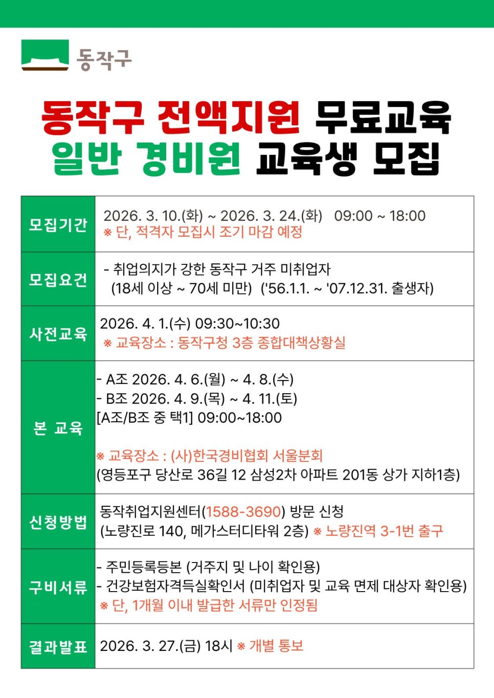 경비직 취업을 희망하지만 교육비 부담이나 자격취득 방법 때문에 고민하셨나요? 지금 바로 동작에서 전액 지원하는 일반 경비원 무료교육 과정에 지원해보세요! 무엇을 배우나요? 이번 교육은 이론과 실무능력을 키워드리는 총 24시간의 알찬 커리큘럼으로 구성되어 있습니다. <이론 (5시간)> 경비업법, 범죄예방론 등 기초 지식 습득 <실무 (19시간)> 시설경비 실무, 사고예방대책...