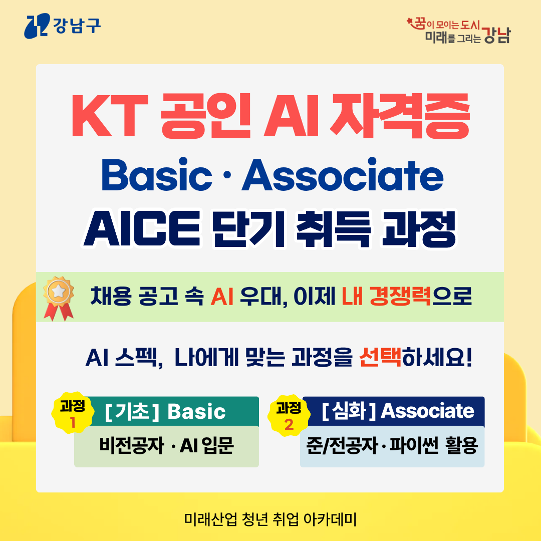 🏆 AI 활용 역량, 자격증으로 증명하세요! 🏆 『KT 공인 AI 자격증 AICE 취득 과정』 교육생 모집 5일(Basic) / 10일(Associate) 단기 완성 💡 KT가 인증하는 AI 실무 역량 💡 AI 스펙, 나에게 맞는 과정 선택 💡 AI 입문(Basic) / 파이썬 데이터 분석(Associate) 🌟 왜 AICE인가? - KT 공식 AI 실무 인증 자격증 (국내 주요 기업 채용 우대) - 비전공자도 가능한 노코딩 과정(Basic) - 국내 최초 국가공인 AI 자격증(Associate) - 취업·이직에 바로 활용 가능한 실전형 스펙 📌과정별 특장점 (나에게 맞는 트랙 선택!) ✅ 과정 1. AICE Basic (입문) - 코딩 몰라도 OK! 비전공자 맞춤형 AI 이해 - AIDU ez 활용: 마우스 클릭만으로 AI 모델링 실습 ✅ 과정 2. AICE Associate (중급) - 준/전공자 파이썬 기반 (Pandas, Numpy) 데이터 분석 - 실전 머신러닝: 직접 코딩하며 모델 구현 🎁 2026 AICE 과정만의 독보적 혜택 ✔️ 원스톱 합격 시스템 → 익숙한 교육 현장에서 교육 마지막 날 즉시 시험 응시! ✔️ 내 돈 0원! 스펙업 전액 지원 → 교육비는 물론 시험 응시료까지 100% 전액 지원! ✔️ KT 전문 강사진 실시간 코칭 → 전문강사의 현장 밀착코칭 및 피드백 🔗 과정 상세보기 : https://blog.naver.com/gn_ictacademy/224206699661 🔗 신청하기 : https://forms.gle/6pvyHMn7jvmTX5Qt8 ⚠️ 지원 시 유의사항 (필독) ⚠️ Basic / Associate 과정은 별도 운영됩니다. 두 과정 모두 지원을 원하실 경우 과정별로 신청서를 각각(총 2회) 제출해 주세요. 🚀 모집 및 교육 개요 - 신청기간 : 3/11(수) ~ 3/25(수) - 교육기간 : ◇ Basic : 4/6(월) ~ 4/10(금) [5일] 10:00~17:00 ◇ Associate : 4/13(월) ~ 4/24(금) [10일] 10:00~17:00 - 교육대상 : 강남구 거주 취업 준비 청년 (19세~39세) 과정별 30명 - 신청선발 : 온라인 신청 후 간단한 유선 면접 최종 선발 - 교육장소 : 충현교회 제3교육관 1층 (강남구 논현로98길 22) Q: 비전공자인데 어떤 과정을 들어야 할까요? A: AI나 코딩이 익숙하지 않다면 Basic을, 파이썬 이해와 코딩 경험으로 AI 데이터 분석역량을 증명하고 싶다면 Associate를 추천합니다! 📞 문의하기 - 문의전화 : 02-595-6696 - 카카오 채널 : 미래산업취창업아카데미(청년) 채널링크 : http://pf.kakao.com/_HWxgxiG
