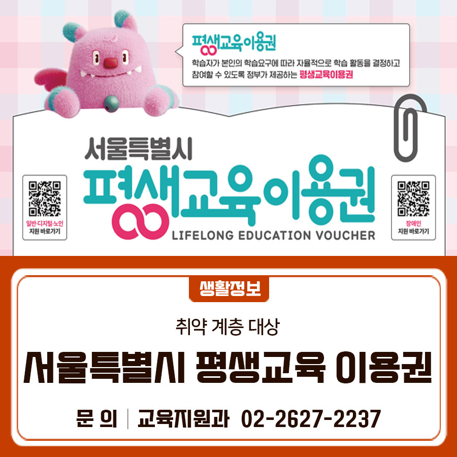 배움의 기회를 넓혀주는 평생교육이용권, 지금 신청해보세요 🫶 접수기간 2026. 3. 16.(월) 10:00~ 4. 9.(목) 18:00 접수방법 온라인(서울시 평생교육이용권 누리집) ▼ 관련링크 ▼ 서울특별시 평생교육이용권 평생교육이용권은 누구나, 언제나, 배움의 기회를 위해 국가와 지자체가 제공하는 이용권 입니다. 평생교육이용권 신청 신청결과 조회 사용기관 안내...