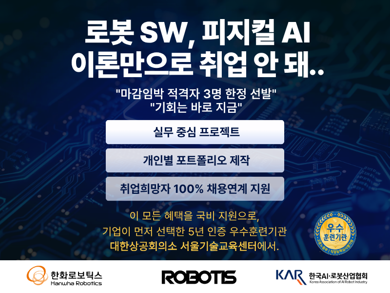 🚨 로봇 SW 개발자 취업, 지금이 마지막 기회입니다. (정원 마감 전, 취업연계 과정 탑승 기회)🚨 #마감임박 취업연계 교육과정, 2명 추가 선발 모집중! 대한상공회의소 × 한화로보틱스 × 로보티즈 AI융합 로봇 SW개발자 3기 채용연계 과정 안녕하세요, "기업이 먼저 선택한 교육기관" 대한상공회의소 서울기술교육센터에서 채용연계 확률이 높은 과정을 소개합니다 :) 1) 과정명 : [한화로보틱스, 로보티즈] AI융합 로봇 SW개발자 (3기) 채용연계과정 2) 교육기간 : '26.04.14 (화) ~ 11.09 (월) / 평일 09:00~17:00 (대면) 3) 교육개요 : 인공지능 프로그래밍 (100h), 프로그래밍 Linux 환경 구축 (100h), ROS기반 통신 IoT 시스템 구축 (140h), Cortex-M ARM 디바이스 활용 (120h), PLC 프로그래밍 산업용 네트워크 (140h), 실무 프로젝트 3개 (330h) 등 4) 지원자격 : 내일배움카드 발급(가능)자, KDT 수강이력 없는 자 5) 대면 교육장소 : 대한상공회의소 서울기술교육센터 (5호선 화곡역 인근) 6) 추천대상 : 컴퓨터공학, 전기전자, 메카트로닉스, 정보통신 등 관련 전공 이수자 혹은 해당 분야에 진출을 희망하는 비전공자 7) 추천 선행학습 내용 : 프로그래밍 언어 등 (C, 파이썬, ROS, 리눅스 등) 8) 교육혜택 : 교육비 지원 ('26년 KDT 규정에 따라 개인별 상황에 따라 1회 한정 자부담 50만원 발생할 수 있음.), 매월 훈련수당 지급, 현장 전문가 직강, 개인별 3~5개 실무 포트폴리오 제작, 우수기업 취업지원 (자소서 첨삭, 모의면접, 컨설팅, 구인요청 기업 프로필 발송, 현직자 특강 및 멘토링 진행) 9) 원서접수 : 대한상공회의소 서울기술교육센터 홈페이지 (https://www.kccistc.net/education/professionalSkillEduDetail.do?rootMenuId=3917&menuId=3922&gaebalwon_cd=09000&gwajeong_no=M2026006) 10) * 모집기간 : ~26. 04. 17 (금) 11) 전화문의 : 02-311-1000