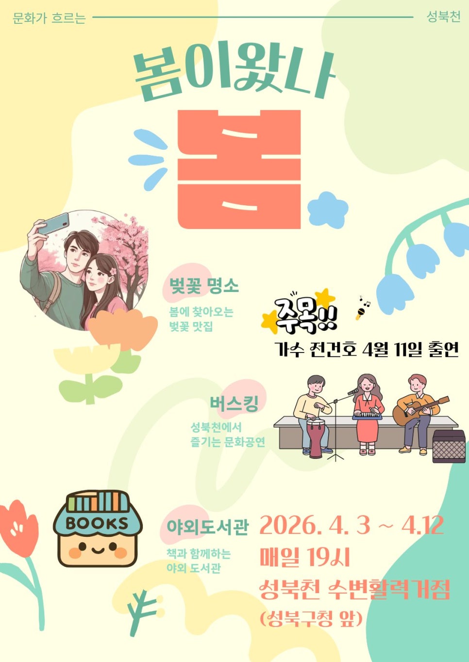 안녕하세요 성북누리입니다. 봄날을 더욱 특별하게 만들어줄 소식을 들고 찾아왔습니다. 😊 평소에도 걷기 좋은 성북천이 감성 가득한 야외 공연장으로 변신한다는 반가운 소식인데요! 눈과 귀가 모두 즐거워지는 문화가 흐르는 성북천 <다시, 봄> 거리공연을 개최합니다 🎉🌸 문화가 흐르는 성북천 <다시, 봄> 개최 안내 📅 일 시: 2026. 4. 3. ~ 4. 12. 매일 19~20시 (10일...