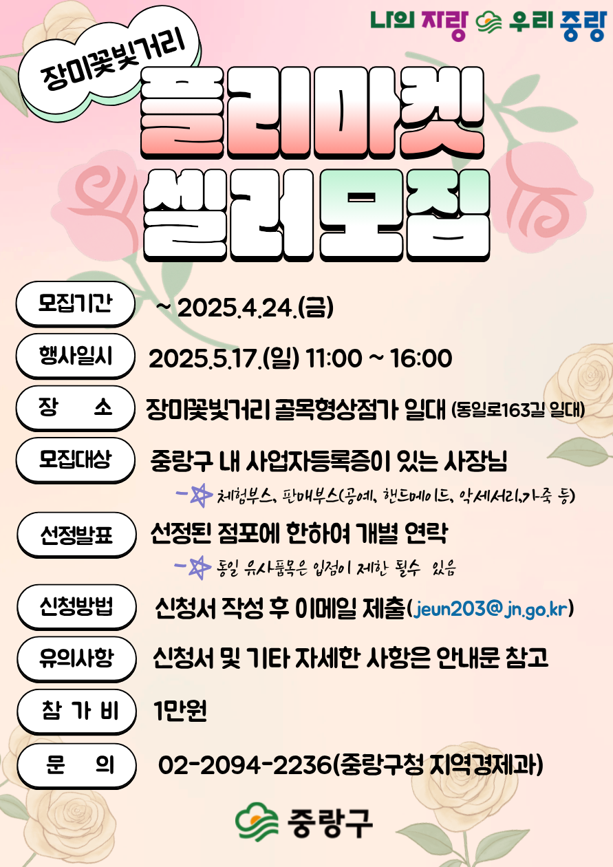 중랑구청<제18회 장미꽃빛거리 플리마켓 셀러모집 안내> 1. 모집대상 : 사업자등록이 되어있고 중랑구 내 사업장이 있는 사장님 2. 모집분야 : 체험부스 , 판매부스 ( 공예 , 핸드메이드 , 악세서리 , 가죽 등 ) 3. 선정방법 : 안내문 참고 4. 모집기간 : 26. ~ 4. 24.( 금 ) 18:00 까지 5. 모집방법 : 신청서 작성 후 담당자 메일 접수 (jeun203@jn.go.kr) 6. 축제일시 : 26. 5. 17. ( 일 ) 11:00 ~ 16:00 ( 시간은 변동 될 수 있음 ) 7. 축제장소 : 장미꽃빛거리 골목형상점가 일대 ( 먹골역 7 번 출구 앞 ) 8. 관련문의 : 중랑구 지역경제과 02-2094-2236