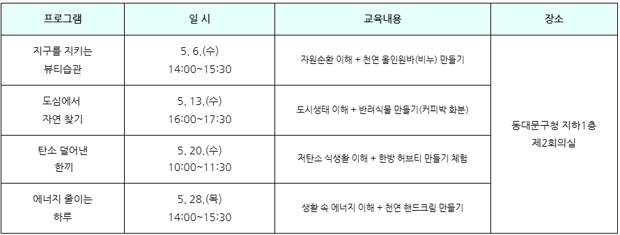 홍담이들도 지구 지키러 출동🌎 비누부터 반려식물까지, 5월엔 동대문구 <넷제로 그린아카데미>에서 초록초록하게 만나요!✨ 🌍 신청대상 동대문구민 누구나 🌍 프로그램 안내 *사정에 따라 체험 내용 및 일정은 변경될 수 있습니다. 🌍 신청기간 4. 30.(목) 09:00 ~ 프로그램별 선착순 20명 마감 🌍 신청방법 동대문구청 기후환경과 전화 신청 02-2127-4653