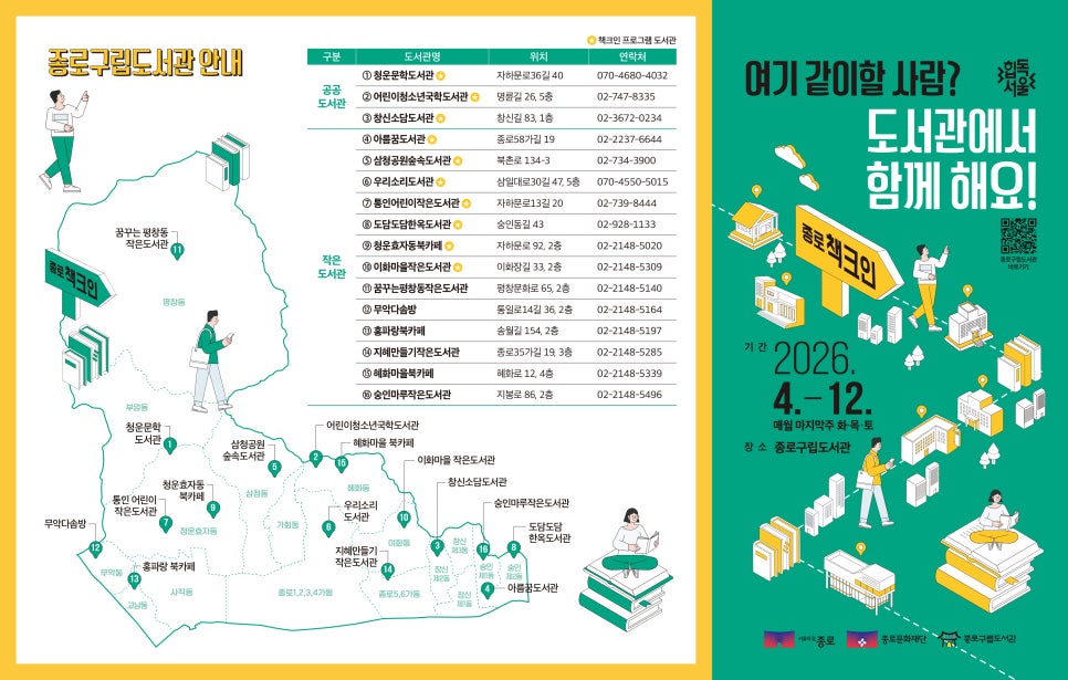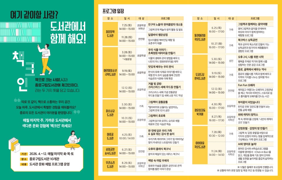 종로구는 오는 4월부터 12월까지, 주민의 일상 속 문화 향유를 위한 「2026종로 책크인」프로그램을 운영합니다. 이번 프로그램은 도서관을 주민 누구나 자유롭게 소통하는 문화예술 공간으로 가꾸기 위해 마련되었으며, 매월 마지막 주 화·목·토요일 관내 구립도서관 10개소에서 다채로운 테마로 만나보실 수 있습니다. ‘책크인’은 ‘책으로 크는 사람(人)’과 ‘종로구립도서관...