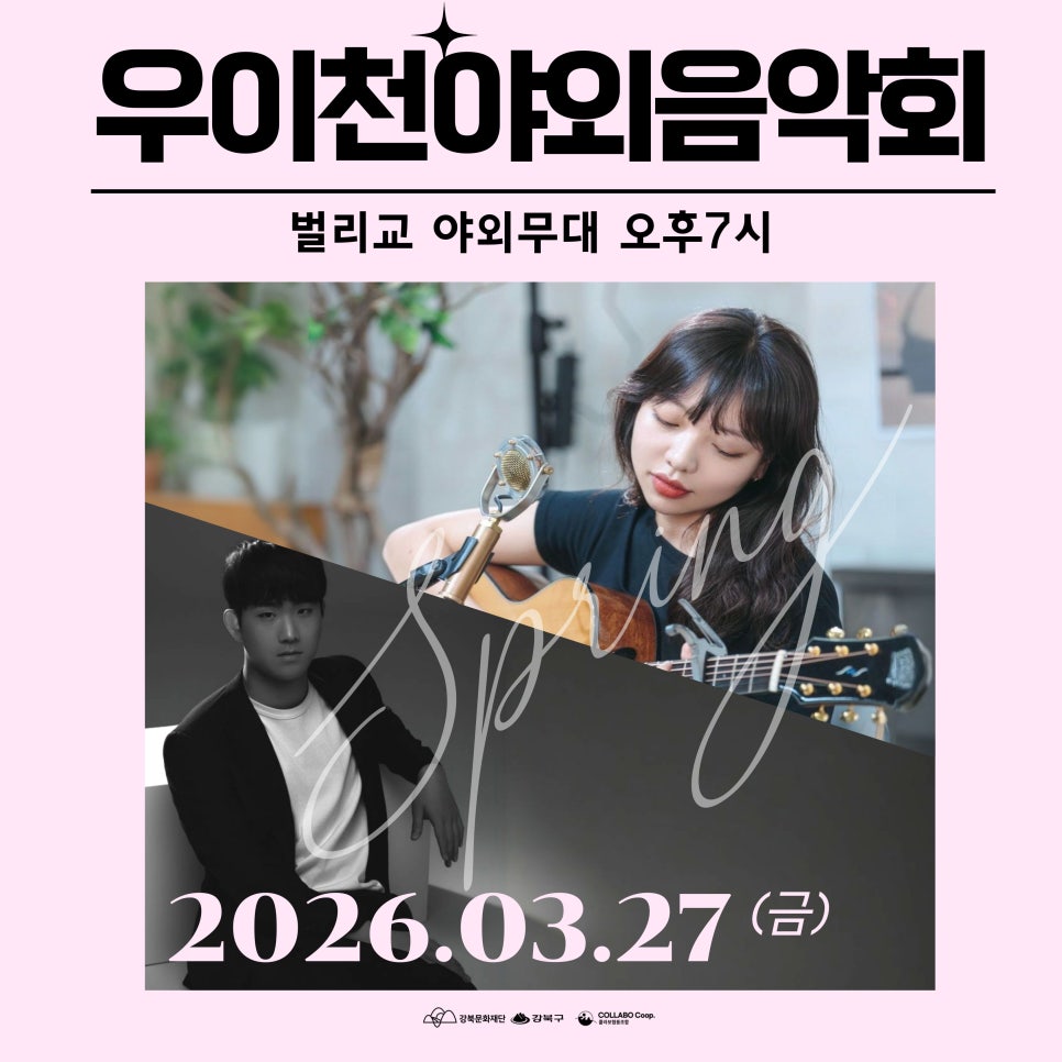 주말에 우이천을 한바퀴 돌아보니... 봄이 왔더라고요. 산수유꽃과 매화는 제법 피었고 목련은 조간만 꽃망울을 터트릴 것 같아요. 나무에도 초록빛 물이 들기 시작했습니다. 그러니 어떻게 해야 겠어요. 야외 버스킹 공연이 있다면 즐겨줘야 하지 않겠습니까? :-) 2가지 봄 감성 넘치는 공연 소식을 몰고 왔으니 많은 관심과 관람 부탁드립니다. 퇴근이든 하교이든 그날의...