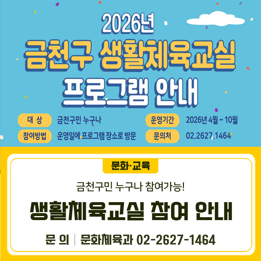 2026년 금천구 생활체육교실이 개강합니다😎 다양한 체육 프로그램을 수강해보세요! 기간: 2026. 4. ~ 10. 장소: 금천구민문화체육센터 등 12개소 대상: 금천구민 누구나 모집: 현장접수 (해당 일시에 운영 장소로 방문 접수) 종목: 건강체조, 러닝크루 등 7종목 ◆ 문 의 ◆ 금천구청 문화체육과 ☎ 02-2627-1464 🔽 좋은 도시 금천의 소식을 더 알고 싶다면? 🔽