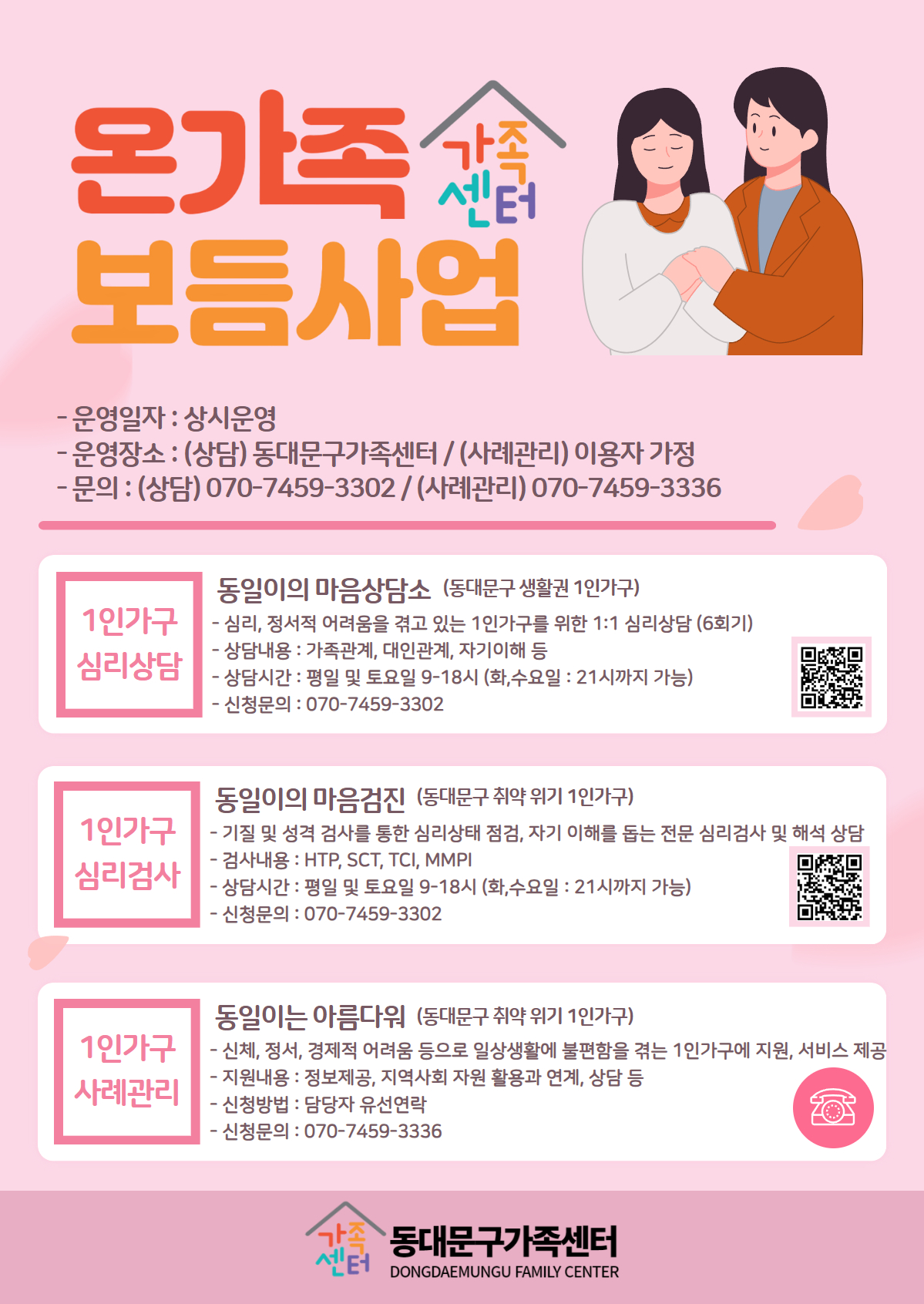 ◆동일이의 마음상담소 (1인가구 심리상담) -심리, 정서적 어려움을 겪고 있는 1인가구를 위한 1:1 심리상담 (6회기) -신청대상 : 동대문구 생활권 1인가구 -상담내용 : 가족관계, 대인관계, 자기이해 등 -상담시간 : 평일 및 토요일 09-18시 (화, 수요일 : 21시까지 가능) -신청문의 : 070-7459-3302 ◆동일이의 마음검진 (1인가구 심리검사) -기질 및 성격 검사를 통한 심리상태 점검, 자기 이해를 돕는 전문 심리검사 및 해석상담 -신청대상 : 동대문구 취약·위기 1인가구 -검사내용 : HTP, SCT, TCI, MMPI -상담시간 : 평일 및 토요일 09-18시 (화, 수요일 : 21시까지 가능) -신청문의 : 070-7459-3302 ◆동일이의 나로서기 (1인가구 사례관리) -신체, 정서, 경제적 어려움 등으로 일상생활에 불편함을 겪는 1인가구에 지원, 서비스 제공 -신청대상 : 동대문구 취약·위기 1인가구 -지원내용 : 정보제공, 지역사회 자원 활용과 연계, 상담 등 -신청방법: 담당자 유선 연락 -신청문의 : 070-7459-3336