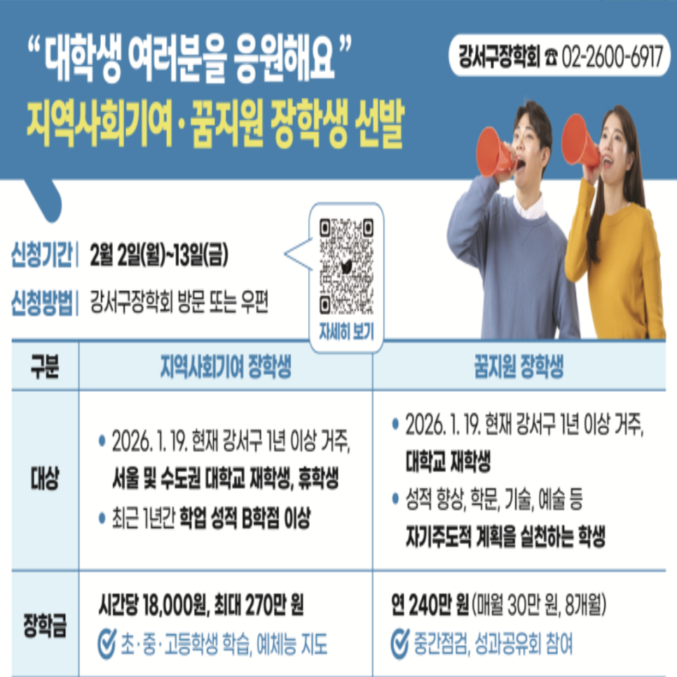 강서구의 미래를 이끌어갈 대학생 여러분을 위한 2026년 지역사회기여·꿈지원 장학생을 모집합니다 😊 📌접수기간: 2026. 2. 2.(월) ~ 2. 13.(금) 📌대상 지역사회기여 장학생: 선발공고일(2026. 1. 19.) 기준 강서구에 1년 이상 거주, 서울 및 수도권 대학교 재학생, 휴학생, 최근 1년간 학업 성적 B학점 이상 꿈지원 장학생: 선발공고일(202...