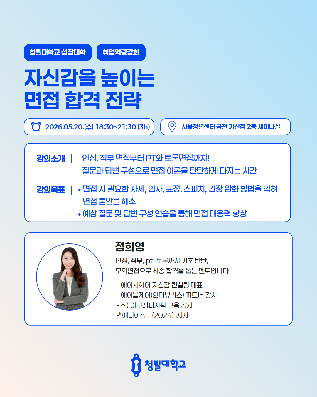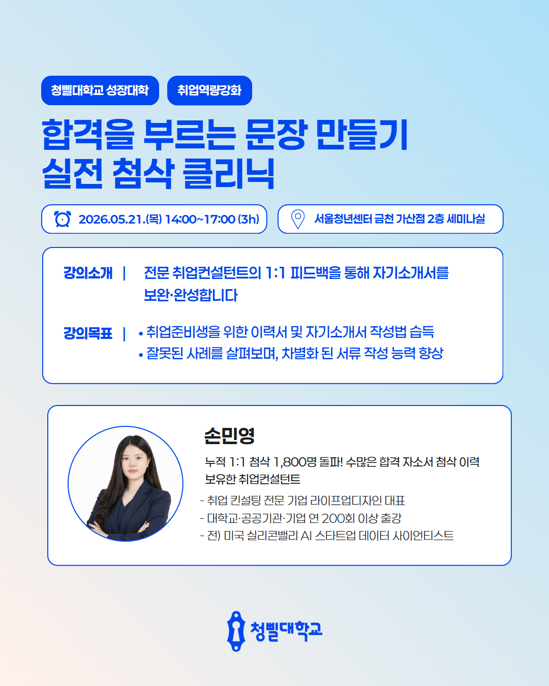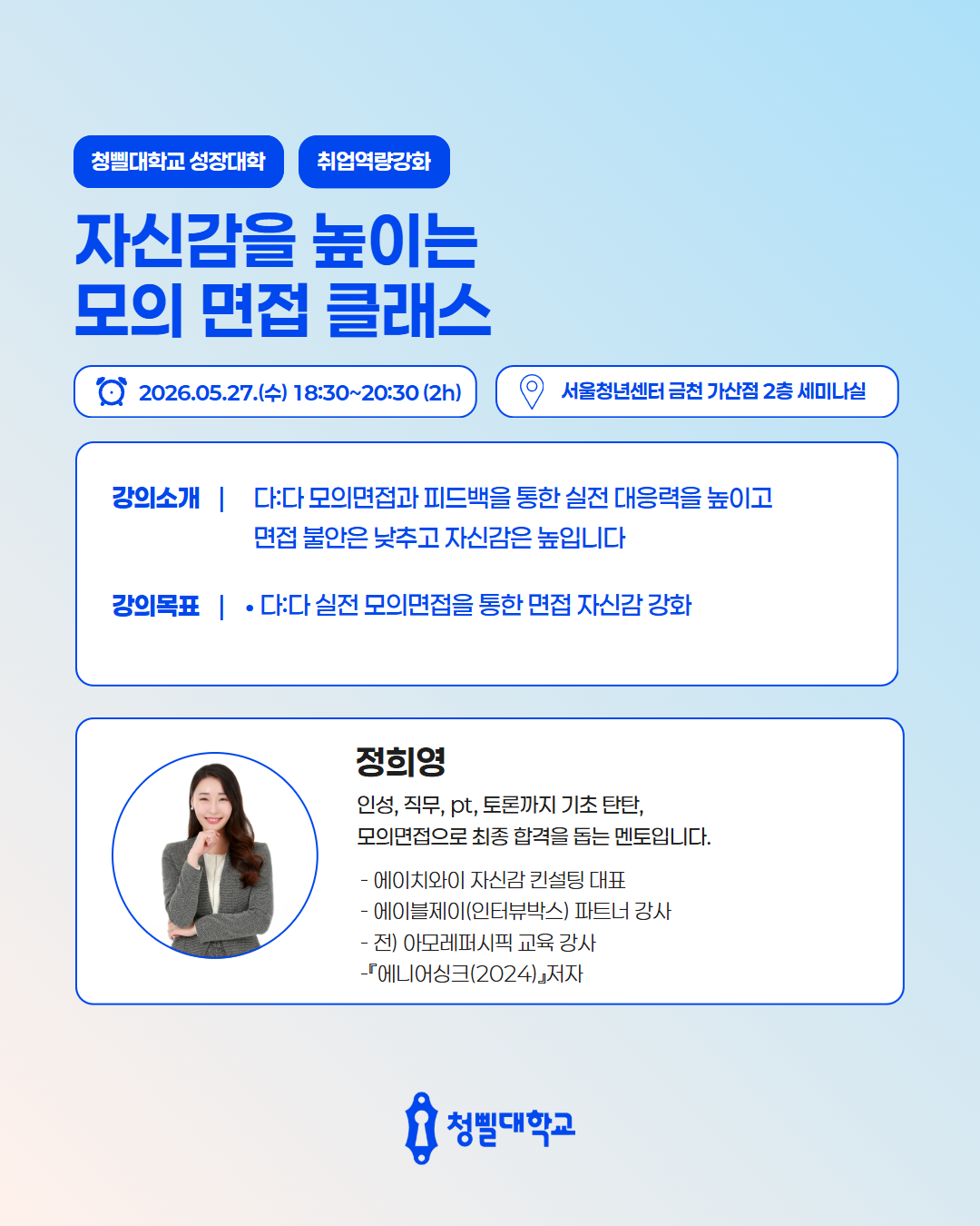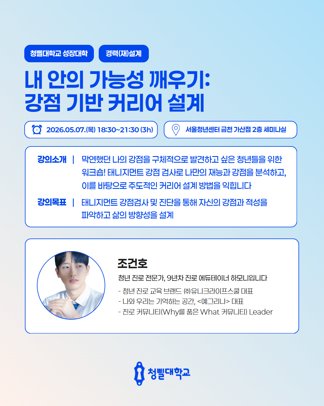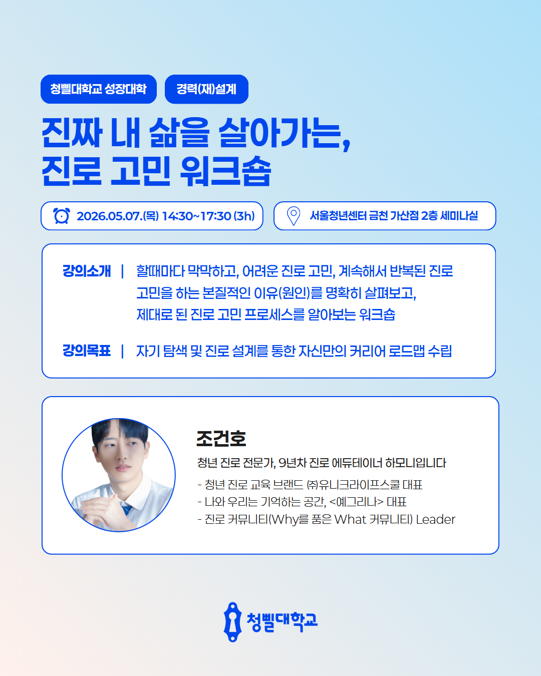 💙2026 청삘대학교 성장대학 5월 프로그램&강사진 소개💙 청삘대학교 성장대학 5월 프로그램 참여자를 모집중✨ 📌신청 대상 • 만 19세 이상 ~ 39세 이하 • 취업 및 이직 준비 청년 📌모집 기간 • 각 프로그램 정원 도달 시 까지 📌5월 프로그램 안내 [경력설계] • 진짜 내 삶을 살아가는, 진로 고민 워크숍 • 내 안의 가능성 깨우기: 강점 기반 커리어 설계 • 버크만으로 찾는 나만의 업무 스타일 • TCI 검사를 통한 자기 이해 워크숍 [취업역량강화] • 취준생을 위한 차별화 된 서류전형 합격 전략 • 합격을 부르는 문장만들기_실전 첨삭 클리닉 • 자신감을 높이는 면접 합격 전략 • 자신감을 높이는 모의 면접 클래스 • 자신감을 높이는 모의 면접 클래스 [직무역량강화] •커리어 UP! 재취업을 위한 실무 엑셀 활용(기초) [마음돌봄] • 마음을 가꾸기: 글쓰기 명상, 테라리움 명상으로 만나는 나 [청년고용정책연계] • 원데이클래스와 함께하는 청년고용정책 알아보기 📌참여 방법 1) 프로그램신청 - 청삘대학교 프로그램 신청 홈페이지를 통해 희망 프로그램 신청 👇청삘대학교 프로그램 신청 홈페이지 https://www.sgunivccbd.com/ 2) 고용24 홈페이지 회원가입 및 초기상담 신청 - 고용24 가입 후 [취업지원 → 청년성장프로젝트] 메뉴 접속 - [서울청년센터 금천 청춘삘딩 초기상담] 프로그램 신청 👇고용24 청년성장프로젝트 https://www.work24.go.kr/wk/v/a/1000/youngGrowIntro.do 3) 초기상담 참여(유선 및 대면) - 초기 상담을 통해 개인 상황에 맞는 맞춤형 프로그램을 함께 설계해드립니다😊 📞 02-865-0597 청삘대학교 프로그램 신청 홈페이지 가입과 고용24 초기상담 신청이 확인되면 순차적으로 연락드릴 예정입니다.