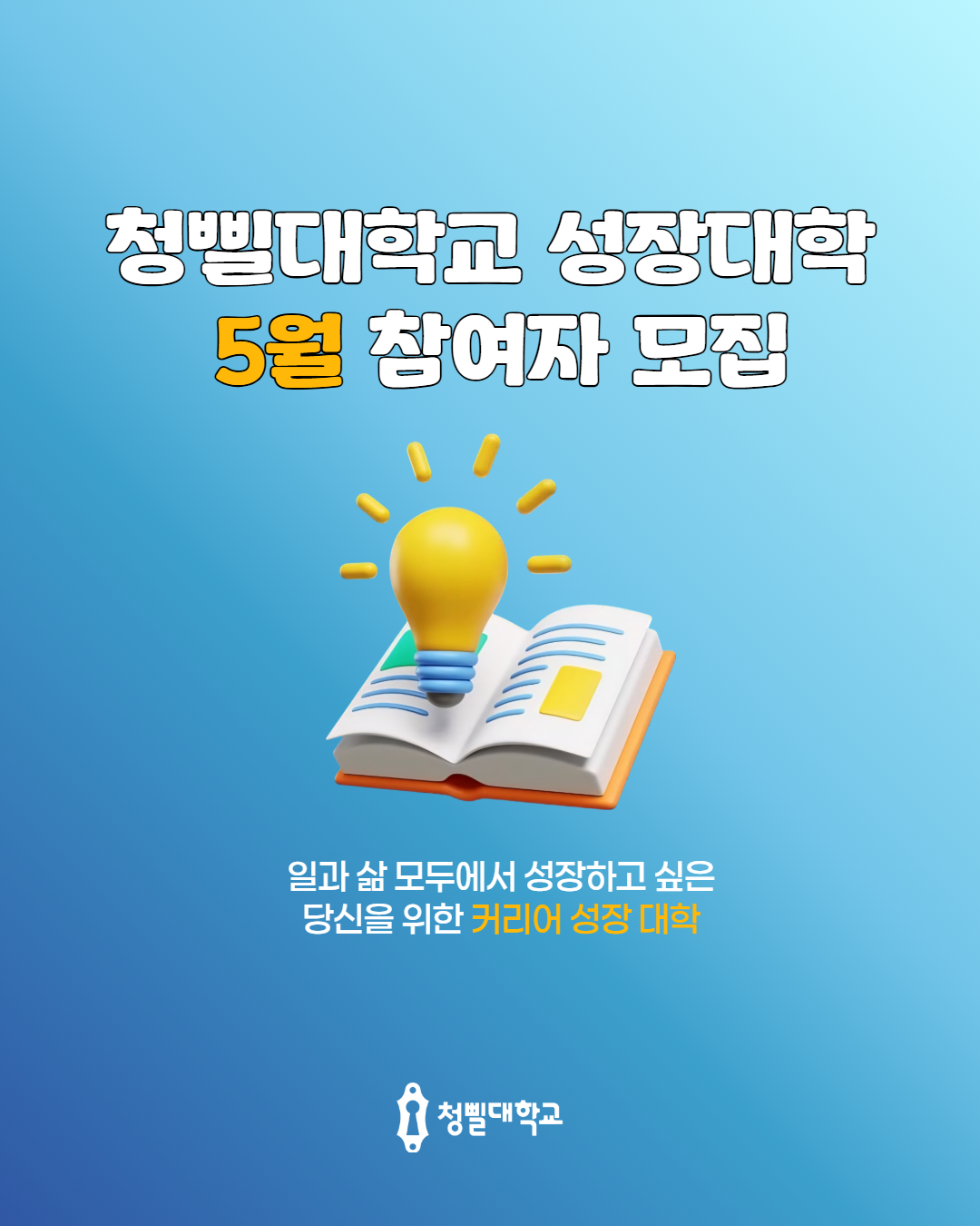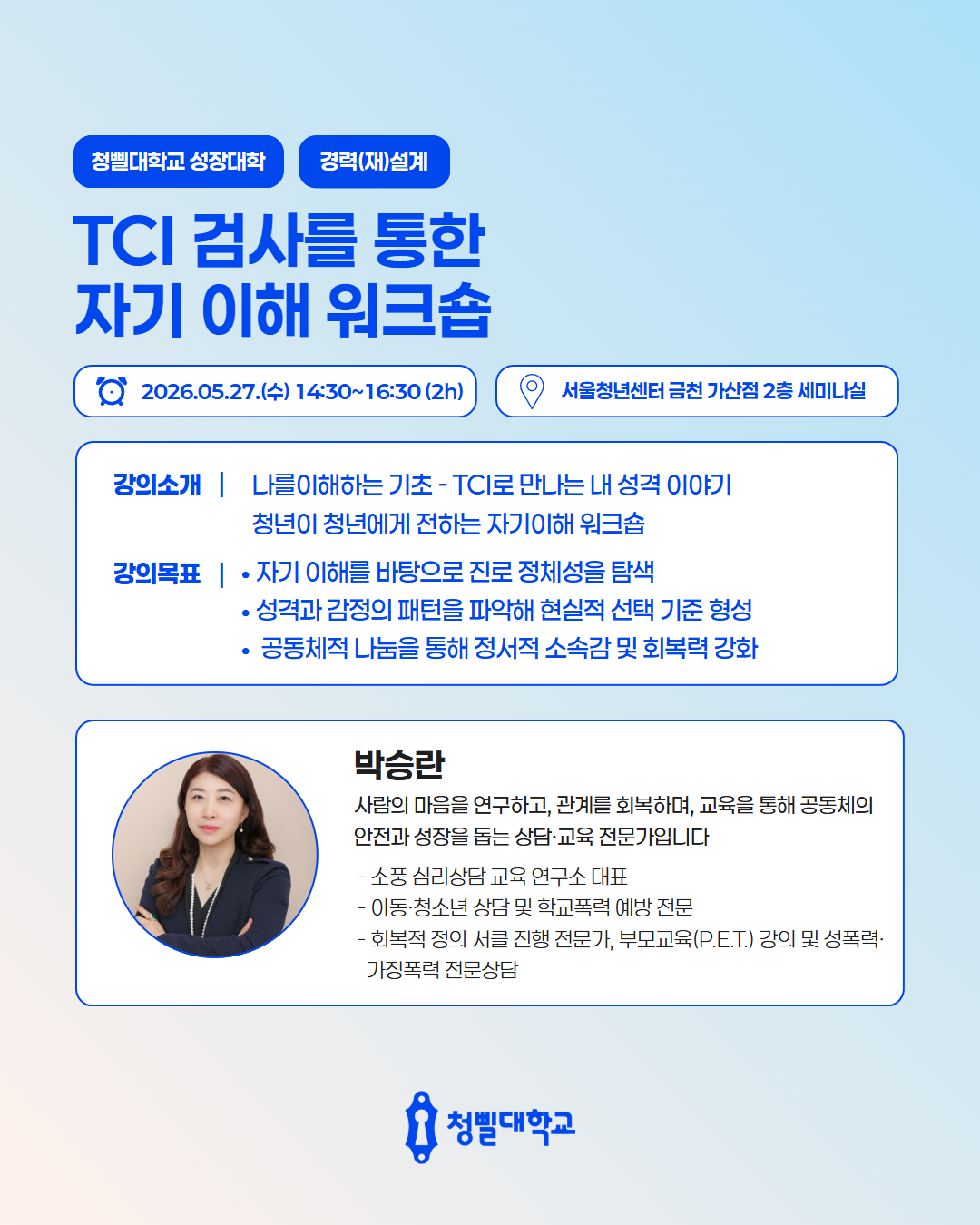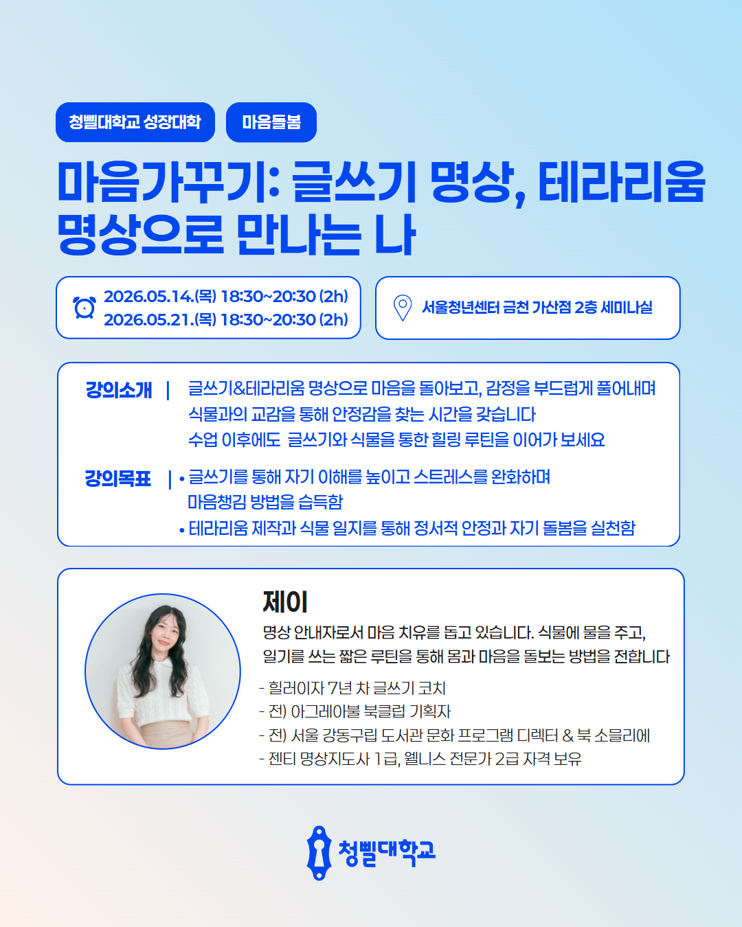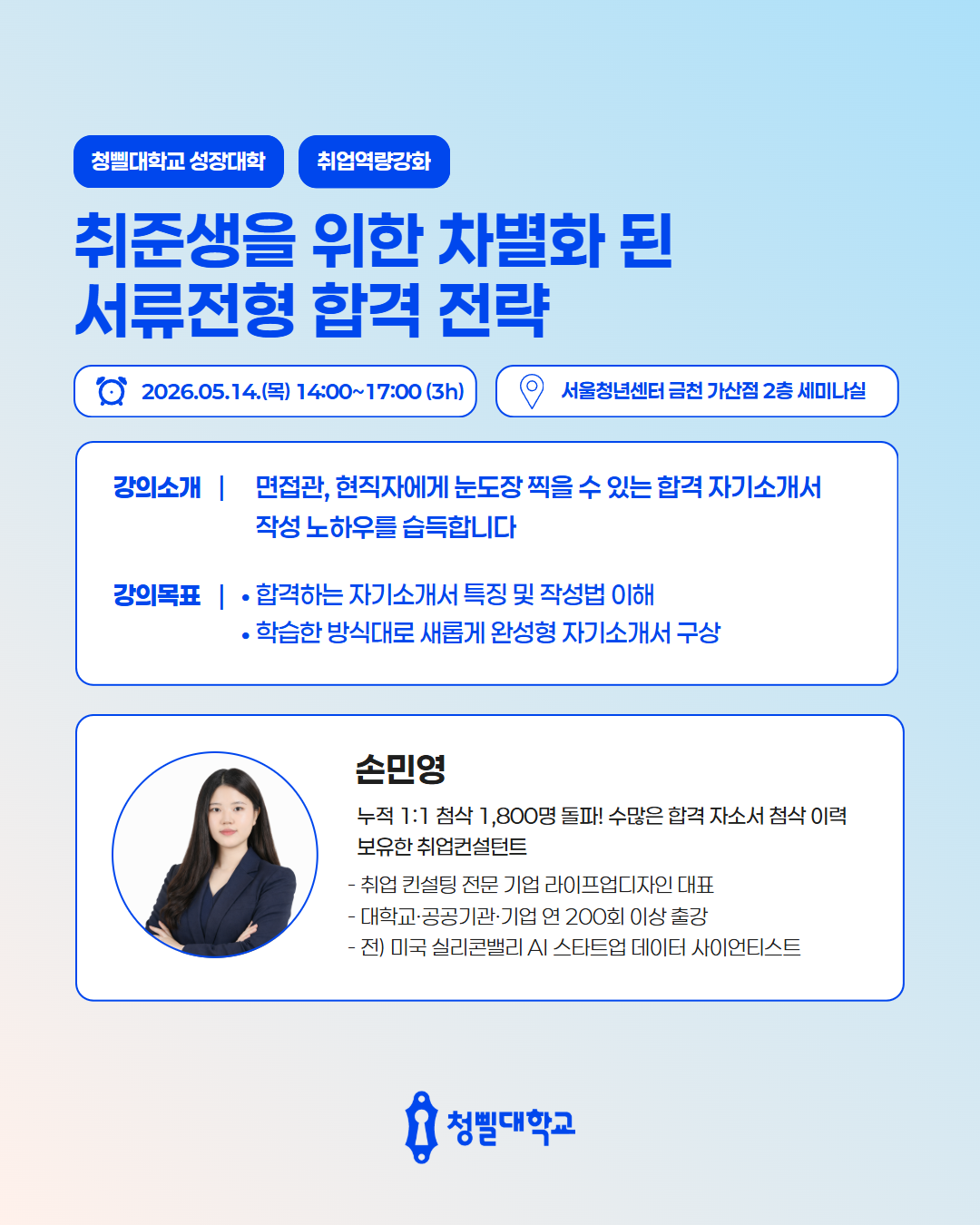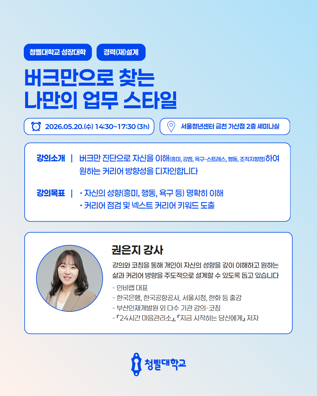💙2026 청삘대학교 성장대학 5월 프로그램&강사진 소개💙 청삘대학교 성장대학 5월 프로그램 참여자를 모집중✨ 📌신청 대상 • 만 19세 이상 ~ 39세 이하 • 취업 및 이직 준비 청년 📌모집 기간 • 각 프로그램 정원 도달 시 까지 📌5월 프로그램 안내 [경력설계] • 진짜 내 삶을 살아가는, 진로 고민 워크숍 • 내 안의 가능성 깨우기: 강점 기반 커리어 설계 • 버크만으로 찾는 나만의 업무 스타일 • TCI 검사를 통한 자기 이해 워크숍 [취업역량강화] • 취준생을 위한 차별화 된 서류전형 합격 전략 • 합격을 부르는 문장만들기_실전 첨삭 클리닉 • 자신감을 높이는 면접 합격 전략 • 자신감을 높이는 모의 면접 클래스 • 자신감을 높이는 모의 면접 클래스 [직무역량강화] •커리어 UP! 재취업을 위한 실무 엑셀 활용(기초) [마음돌봄] • 마음을 가꾸기: 글쓰기 명상, 테라리움 명상으로 만나는 나 [청년고용정책연계] • 원데이클래스와 함께하는 청년고용정책 알아보기 📌참여 방법 1) 프로그램신청 - 청삘대학교 프로그램 신청 홈페이지를 통해 희망 프로그램 신청 👇청삘대학교 프로그램 신청 홈페이지 https://www.sgunivccbd.com/ 2) 고용24 홈페이지 회원가입 및 초기상담 신청 - 고용24 가입 후 [취업지원 → 청년성장프로젝트] 메뉴 접속 - [서울청년센터 금천 청춘삘딩 초기상담] 프로그램 신청 👇고용24 청년성장프로젝트 https://www.work24.go.kr/wk/v/a/1000/youngGrowIntro.do 3) 초기상담 참여(유선 및 대면) - 초기 상담을 통해 개인 상황에 맞는 맞춤형 프로그램을 함께 설계해드립니다😊 📞 02-865-0597 청삘대학교 프로그램 신청 홈페이지 가입과 고용24 초기상담 신청이 확인되면 순차적으로 연락드릴 예정입니다.