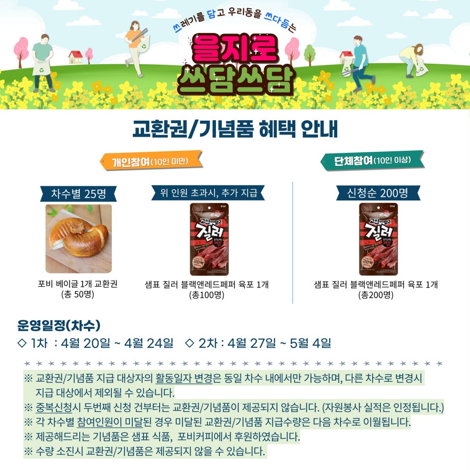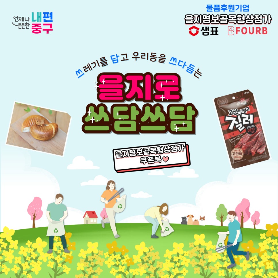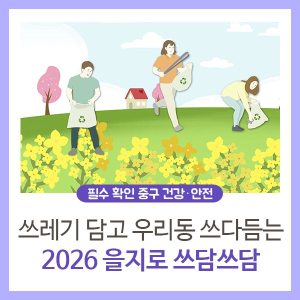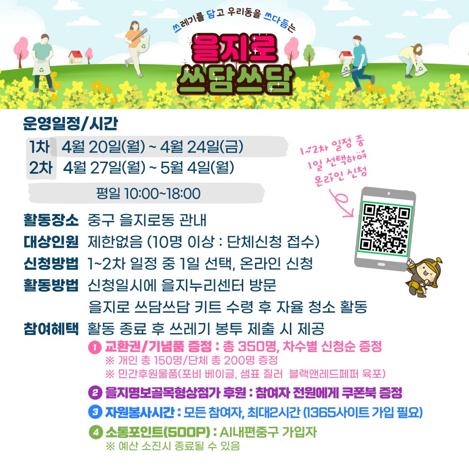 2026년 상반기 을지로 쓰담쓰담 안내드립니다🧹✨ ※ 을지로 플로깅 맞아요😊 ✅ 운영일정/시간 👉 1차: 4월 20일(월) ~ 4월 24일(금) 👉 2차: 4월 27일(월) ~ 5월 4일(월) ※ 평일 10:00~18:00 ✅ 활동장소: 중구 을지로동 관내 ✅ 대상인원: 제한없음 (10명 이상 : 단체신청 접수) ✅ 신청방법 1~2차 일정 중 1일 선택, 온라인 신청 - QR코드 ...