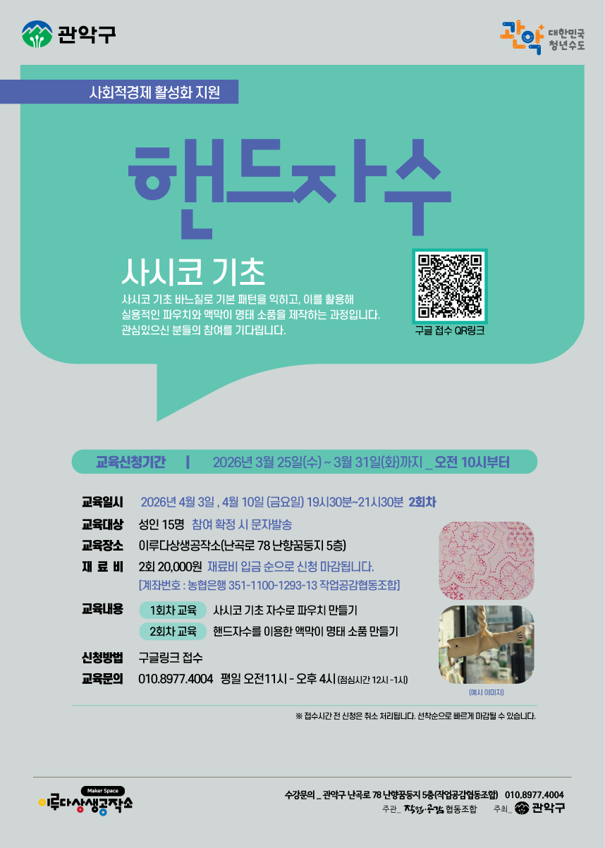 차분한 바느질로 손끝의 여유를 느껴보는 실습교육✨ 사시코 기초 바느질을 배우고 기본 패턴을 익혀 파우치와 액막이 명태 소품을 직접 만들어보는 공예 프로그램입니다. 처음이라도 부담 없이 참여할 수 있어 공예를 좋아하는 분들께 추천드립니다. 일상 속 작은 힐링을 찾고 싶다면 많은 관심과 참여 바랍니다. 😊 ✅ 교육기간 <1회차> 2026. 4. 3.(금) 19:30~21:30...