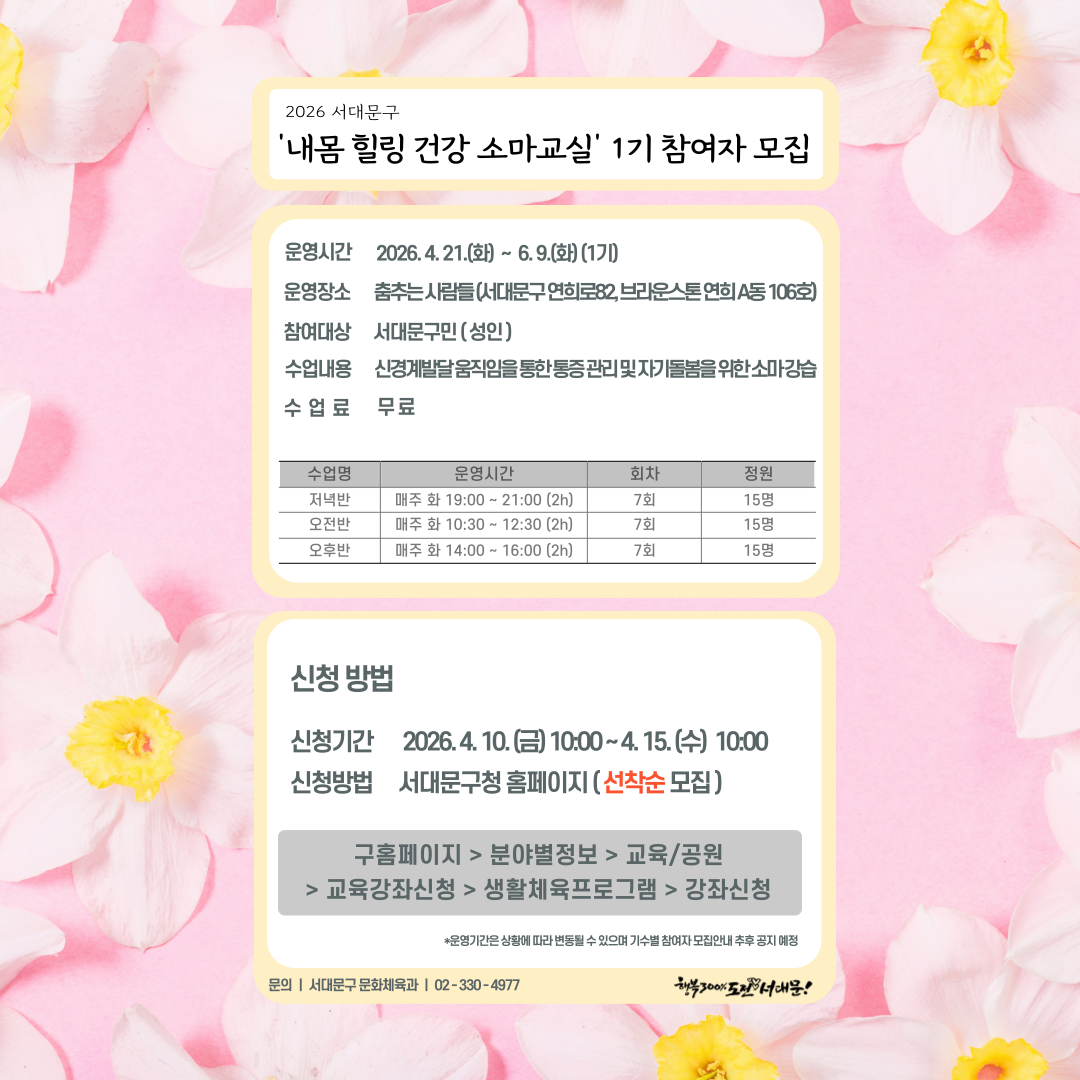 ○안내사항 - 참여자 선정은 선착순이며 4.16.(목) ~ 4.20.(월)에 개별 문자 안내될 예정입니다. - 중복신청 불가하며 3개 교실 중 하나만 선택하여 신청해주세요. - 모집정원을 초과하는 신청자는 접수번호 순으로 대기자 등록합니다. - 운영기간 중 월초 2회 이상 무단 불참 시 별도 연락 후 대기자에게 참여가 안내됩니다. - 운영기간 중 3회 이상 무단 불참 시 수업 참여...