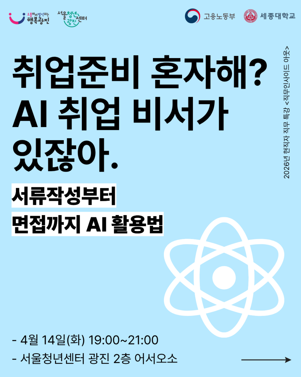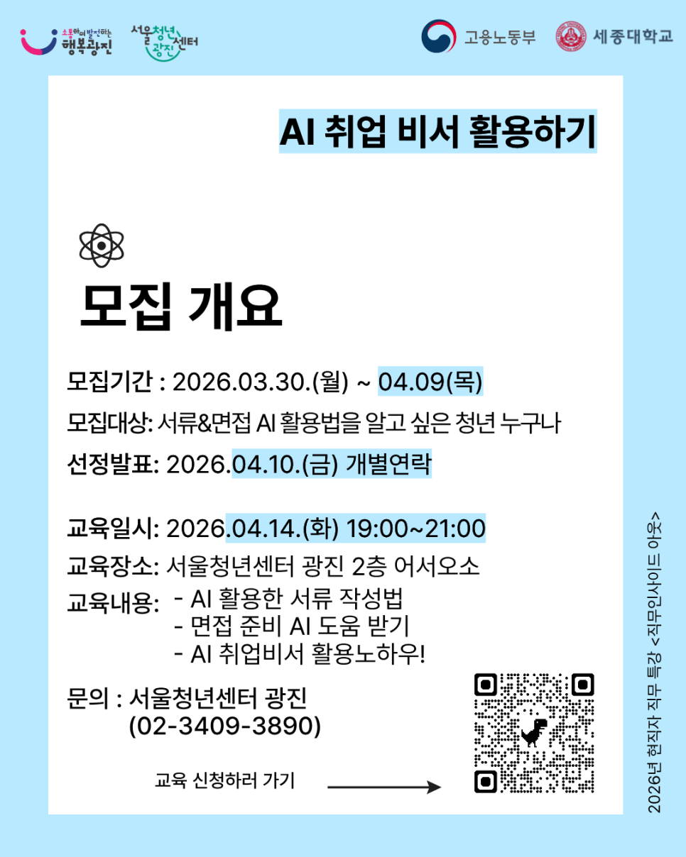 서울청년센터광진<2026년 현직자 특강 <직무인사이드 아웃> "AI 취업비서 활용하기" 참여자 모집(~4/9)> 안녕하세요. 서울청년센터 광진 면입니다.🌷 취업/이직 준비 아직도 혼자 하고 계시나요? 요즘은 AI를 활용해 더 효율적으로 준비하는 방법이 주목받고 있습니다! 그래서 준비한 2026년 현직자 특강 <직무 인사이드아웃>의 첫번째 이야기! "AI 취업비서 활용하기" ✔ 자소서 작성에 AI 활용하는 법 ✔ 면접 준비에 AI 도움 받는 법 ✔ AI취업비서 활용 노하우까지! 혼자 고민하는 시간 줄이고 취업 준비, 더 똑똑하게 시작해보세요🔥 [모집개요] ✍️모집 기간 : 2026년 3월 30일(월) ~ 2026년 4월 9일(목) ✍️ 진행 일정 : 2026년 4월 14일(화) 19:00~21:00 ✍️ 진행 장소: 서울청년센터 광진 어서오소 (광진구 능동로 245, 2층) ✍️ 참여 대상 : 취업/이직을 준비하고 있는 청년(19세~39세) 중 AI를 활용하는 방법을 알고싶은 청년 누구나! ※ 단, 의무복무 제대군인인 경우 복무기간 고려하여 최대 3년 이내 연령 상한 연장 적용 ✍️ 진행 내용 : 1) AI활용 핵심 키워드 추출 및 맞춤 서류작성 가이드 안내 2) AI 기반 면접답변 구성 프로세스 안내 3) 심화활용전략 : AI 취업비서 활용 노하우 교육 ✍️ 선정발표 : 2026년 4월 10일(금) 개별 문자 안내 ✍️ 신청방법 : 구글 설문지 작성 후 제출
