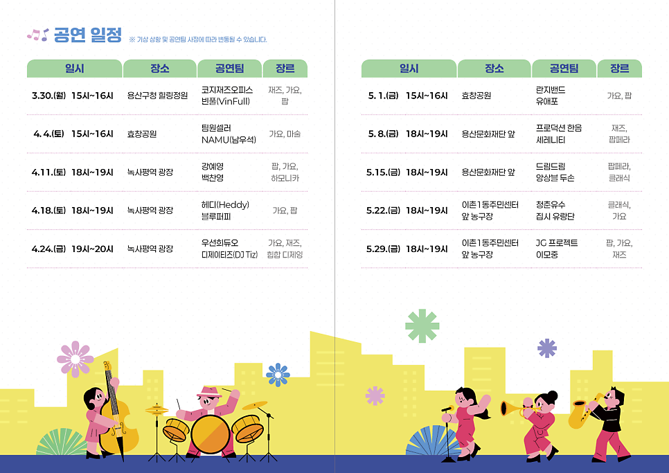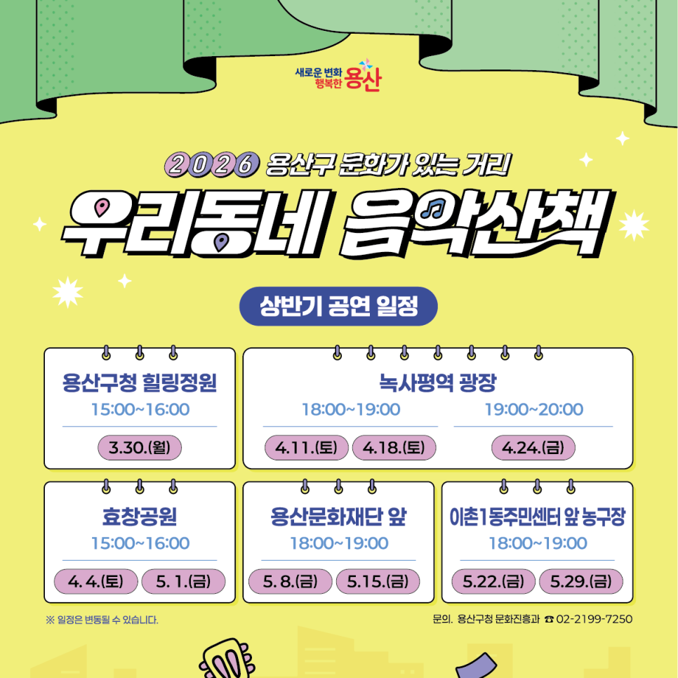 [안내] 2026 용산구 '우리동네 음악산책' 상반기 공연 일정 총정리! 🎶 따스한 봄바람이 부는 요즘, 멀리 나가지 않아도 우리 집 앞에서 고품격 라이브 공연을 즐길 수 있는 특별한 선물을 용산구가 준비했습니다. 바로 <2026 용산구 우리동네 음악산책>인데요! 여러분의 힐링을 책임질 이번 상반기 전체 공연 일정을 완벽하게 정리해 드립니다! (※ 기상 상황 및 ...