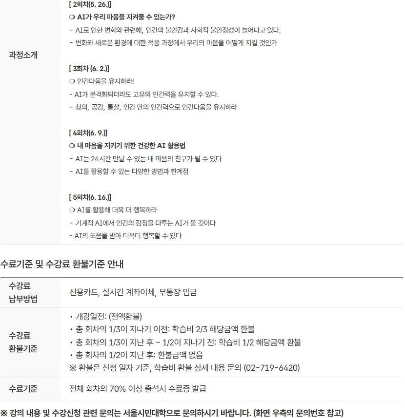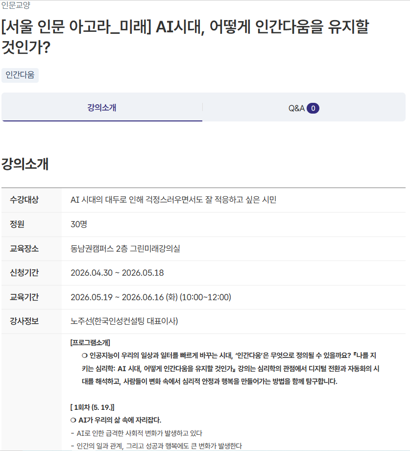 강사 노주선(한국인성컨설팅 대표이사) 신청기간 2026.04.30 ~ 2026.05.18 교육기간 2026.05.19 ~ 2026.06.16 (화) 강의시간 10:00~12:00 교육장소 동남권캠퍼스 2층 그린미래강의실 수강대상 AI 시대의 대두로 인해 걱정스러우면서도 잘 적응하고 싶은 시민 정원 30명 수강료 10000원 문의번호 02-442-6827