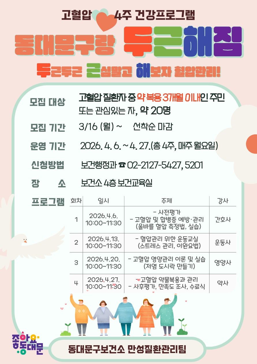 동대문구보건소에서 "동대문구랑 두근해짐" 고혈압 4주 건강프로그램의 참여자를 모집합니다. 고혈압에 대한 궁금증을 해결하는 시간으로 준비 중이니 많은 참여 바랍니다. 감사합니다^^ ※모집 대상 : 고혈압 질환자 중 약 복용 3개월 이내인 주민 또는 관심 있는 자 ※인 원 : 약 20명 ※모집 기간 : 2026. 3. 16.(월) ~ (선착순 마감) ※장 ...