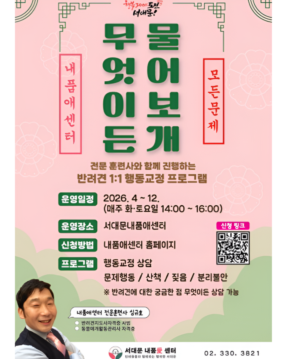 🐶 우리 개가 달라졌어요! 반려견 행동 고민, 이제 혼자 고민하지 마세요. 서대문내품애센터에서 전문 훈련사와 함께하는 1:1 반려견 행동교정 프로그램을 운영합니다. 짖음, 분리불안, 산책 문제 등 무엇이든 상담해보세요! 📌 프로그램 안내 ✔ 운영기간: 2026. 4. ~ 12. (매주 화·토요일 14:00 ~ 16:00) ✔ 운영장소: 서대문내품애센터 ✔ 신청방법: 내품애센터 홈...
